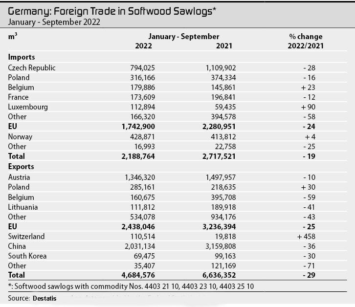 В течение третьего квартала 2022 года Германия экспортировала в Китай 748 782 м³ (июль-сентябрь 2021 года: 1,227 млн м³) пиловочников хвойных пород; по сравнению с предыдущим годом это представляет собой снижение на 39%. В первом (-31%) и втором кварталах (-37%) экспорт уже сократился такими же высокими темпами.