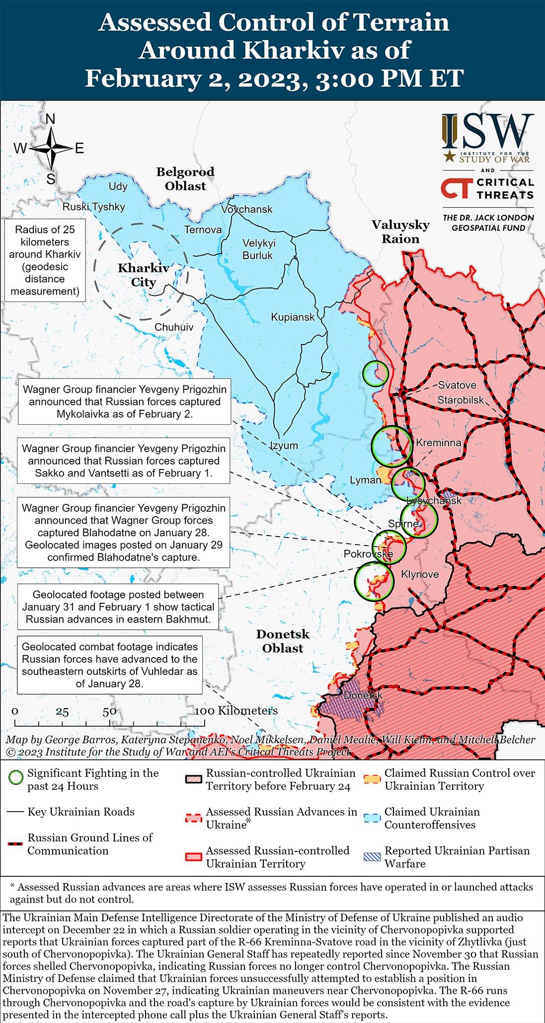 Российские войска продолжили наземные атаки вокруг Бахмута 2 февраля. Украинский Генштаб доложил, что украинские войска отразили российские атаки на сам Бахмут; северо-восток Бахмута вблизи Спирное (27 км к северо-востоку), Белогоровка (20 км к северо-востоку), Васюковка (10 км к северу), Благодатное (5 км к северу) и Красная Гора (4 км к северу); и к юго-западу от Бахмута вблизи Клещеевки (7 км к юго-западу). Геолоцированные кадры подтверждают, что российские войска постепенно продвигаются к северо-востоку от Бахмута вблизи Роздоловка (15 км к северо-востоку от Бахмута) и на северной окраине самого Бахмута. Финансист группы Вагнера Евгений Пригожин утверждал, что группа Вагнера захватила 1 и 2 февраля соответственно два населенных пункта Сакко и Ванцетти и Николаевку, расположенные примерно в 15 км к северу от Бахмута. Российские милблогеры продолжали утверждать, что силы группы Вагнера пытаются окружить Красную Гору со стороны Парасковьевки (5 км к северу от Бахмута) и Благодатного и добиваются успехов в городских районах на северной и восточной окраинах Бахмута. Российские милблогеры также сообщили, что украинские войска удерживают свои позиции в Ивановском (5 км к западу от Бахмута по трассе Т0504 Константиновка-Часов Яр-Бахмут) и утверждали, что боевики Вагнера продвинулись в пределах двух километров от трассы Т0504.