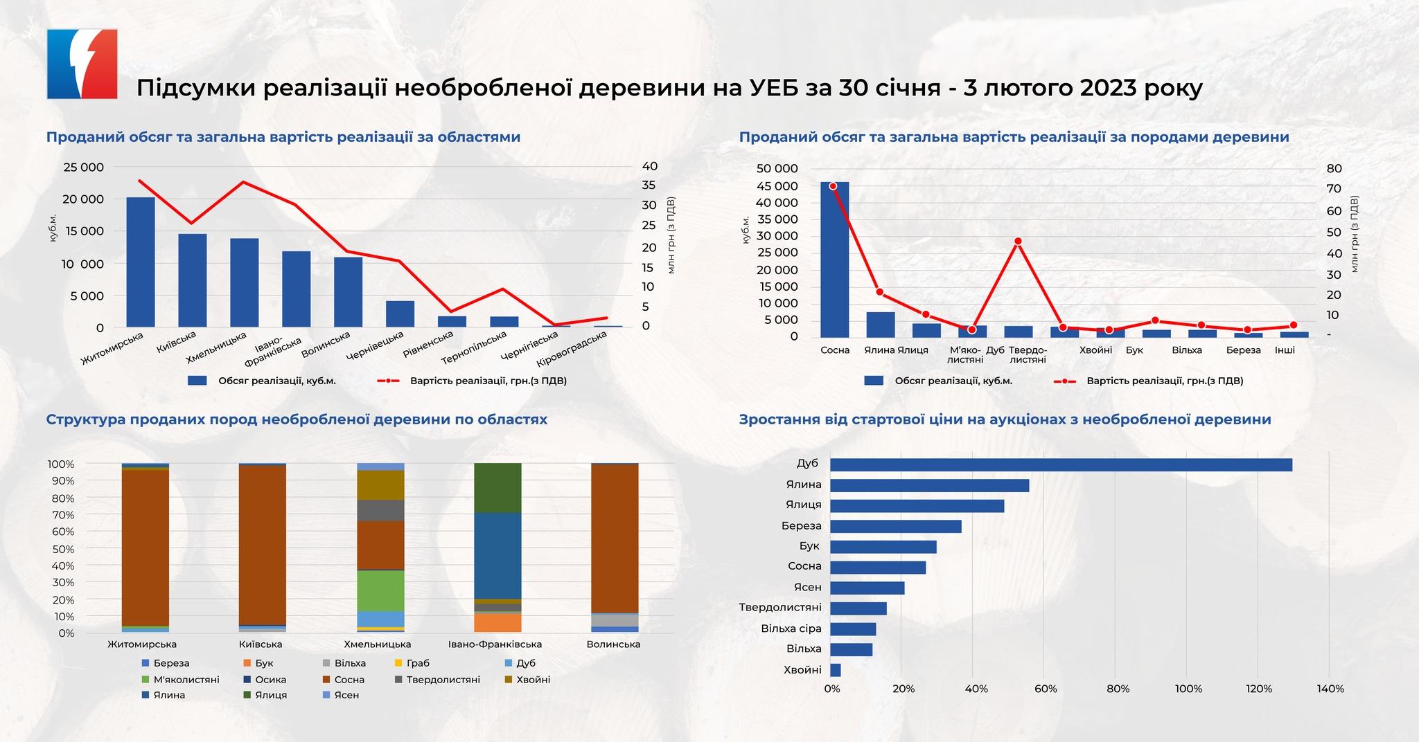 Реалізація необробленої деревини відбувалась у Житомирській, Київській, Хмельницькій, Івано-Франківській, Волинській, Чернівецькій та інших областях.