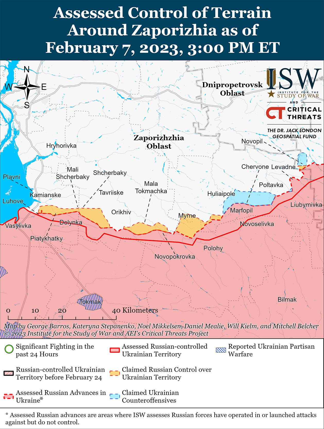 7 февраля российские войска не добились подтвержденных территориальных завоеваний на южном направлении. Член Оккупационной администрации Запорожской области Владимир Рогов заявил 7 февраля, что российские войска захватили свои передовые позиции в Запорожской области и укрепляют новые позиции, захваченные в январе. Советник украинской Херсонской областной военной администрации Сергей Хлан заявил 6 февраля, что российские войска продолжают обстреливать восточный (левый) берег Днепра, чтобы побудить проживающих там украинских мирных жителей переселиться вглубь оккупированных районов. Кроме того, 7 февраля украинские войска продолжают наносить удары по российским районам сосредоточения в Херсонской области. Хлан добавил, что украинские войска уничтожили российское судно и нанесли удар по российской базе на восточном берегу Днепра. На геолоцированных кадрах, опубликованных 7 февраля, показан удар беспилотника и артиллерии Государственной пограничной службы Украины по российским позициям в Кардашинка (13 км к югу от г. Херсон на восточном берегу Днепра) в Херсонской области. 7 февраля российские войска продолжили плановые обстрелы в Херсонской, Запорожской, Днепропетровской и Николаевской областях.