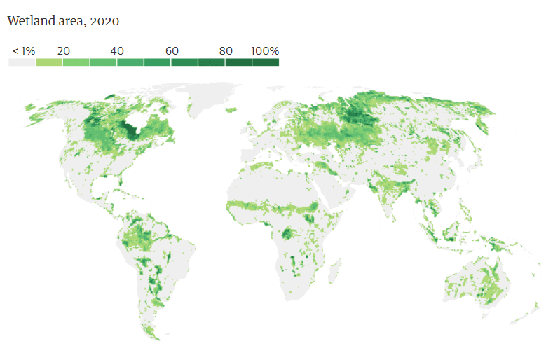 До сих пор было неизвестно, сколько водно-болотных угодий осталось — по предыдущим оценкам, с 1700 года было уничтожено от 28% до 87%. Впервые исследователи объединили глобальные исторические записи с картами сегодняшних водно-болотных угодий, чтобы создать более точную карту и обнаружили, что примерно 20% всех водно-болотных угодий уничтожены. Однако больше всего пострадала Европа: Ирландия потеряла более 90% своих водно-болотных угодий, Германия, Литва и Венгрия — более 80%, а Великобритания, Нидерланды и Италия — более 75%.