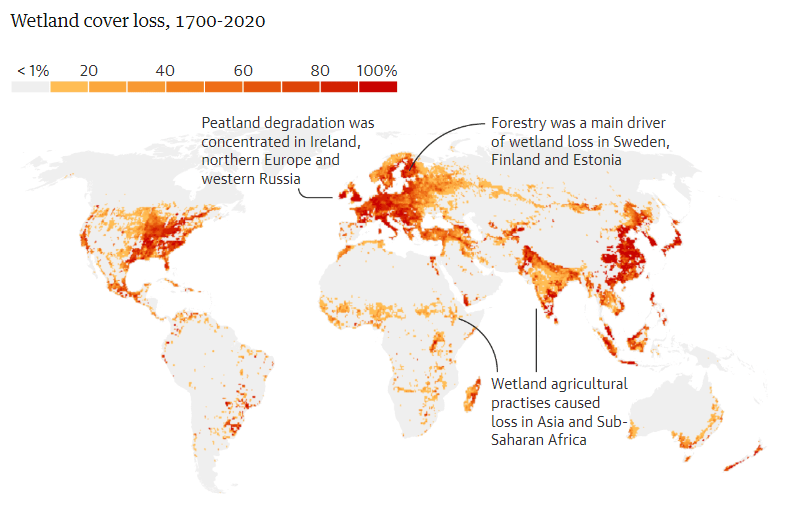 Последние исследования показывают, что половина водно-болотных угодий в Европе, континентальной части США и Китае была уничтожена за последние 300 лет, а некоторые районы, включая Великобританию, Ирландию и Германию, потеряли более 75% естественных болот. Во всем мире исчезла территория размером с Индию.