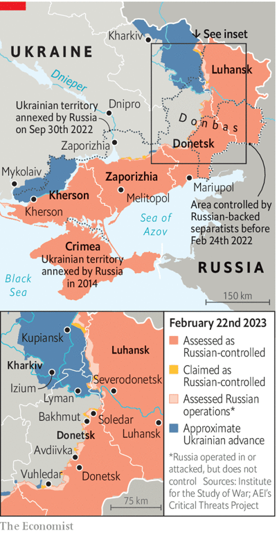 С конца января российская армия перебрасывает войска и артиллерийский огонь вдоль широких участков линии фронта на востоке. На севере, в Луганской области, Россия атакует Купянск, железнодорожный узел, и Лиман, небольшой город, оба из которых Украина освободила осенью. На юге, в Донецкой области, Россия теснит Авдеевку и Угледар, которые находятся по обе стороны Донецка. Фокусом его усилий, неизменным с августа, остается Бахмут, скромный город, приобретший для России статус талисмана.