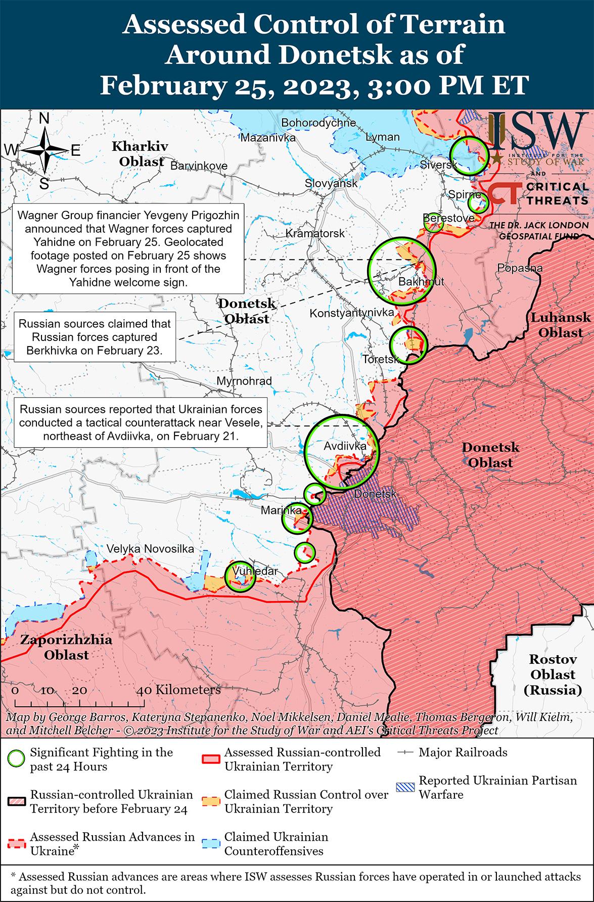 Российские войска продолжили наступательные действия вокруг Бахмута 25 февраля. Генеральный штаб Украины сообщил, что российские войска провели неудачные наступательные операции вблизи Орехово-Васильевка (11 км к северо-западу от Бахмута), Берховка (4 км к северу от Бахмута), Ивановское (6 км к западу от Бахмута) и Пивничное (21 км к юго-западу от Бахмута). Финансист группы Вагнера Евгений Пригожин утверждал, что бойцы группы Вагнера захватили Ягодное (2 км к северу от Бахмута) и разместили фотографию бойцов Вагнера, позирующих возле приветственного знака поселения, который позже был геолоцирован, что указывает на то, что бойцы Вагнера, вероятно, захватили поселение. Российские источники продолжали утверждать, что боевики «Вагнера» захватили Берховку и завершили зачистку поселения, хотя ISW не наблюдал визуального подтверждения этих утверждений. Российские источники предоставили противоречивые утверждения о российских достижениях вблизи Дубово-Васильевки (6 км к северо-западу от Бахмута), при этом оккупационный чиновник Запорожской области Владимир Рогов утверждал, что боевики Вагнера захватили поселение, а известный милблогер утверждал, что российские войска только вошли в поселение. Другой известный российский милблогер утверждал, что на подступах к Дубово-Васильевке продолжаются бои. Российские источники утверждали, что украинские войска разрушили плотину к северу от Бахмута и затопили район Ступки в Бахмуте, чтобы замедлить продвижение России с севера, хотя ISW не видел никаких визуальных доказательств этих утверждений. Российские милблогеры утверждали, что боевики «Вагнера» совершали штурмы вблизи Железное (11 км к северу от Бахмута), Васюковка (14 км к северу от Бахмута), Роздоловка (17 км к северо-востоку от Бахмута) и Федоровка (18 км к северу от Бахмута). Геолоцированные кадры, опубликованные 24 февраля, указывают на то, что российские войска, вероятно, сделали незначительные успехи в восточном Бахмуте. Пограничная служба Украины сообщила, что россияне направили свои наиболее боеспособные силы в Бахмут и что вокруг города много осужденных группы Вагнера. Российские милблогеры утверждали, что российские войска продвинулись в южной части Бахмута и что боевики Вагнера провели наземные атаки вблизи Часов Яр (12 км к западу от Бахмута) и Дылевка (15 км к юго-западу от Бахмута).