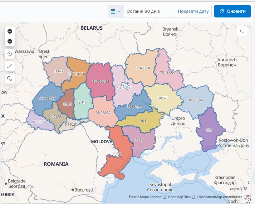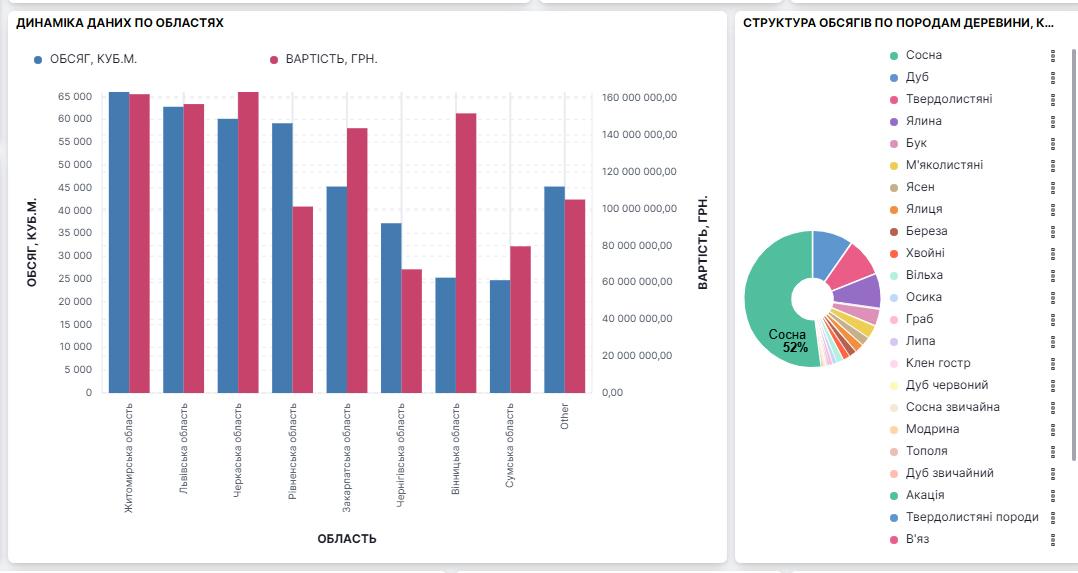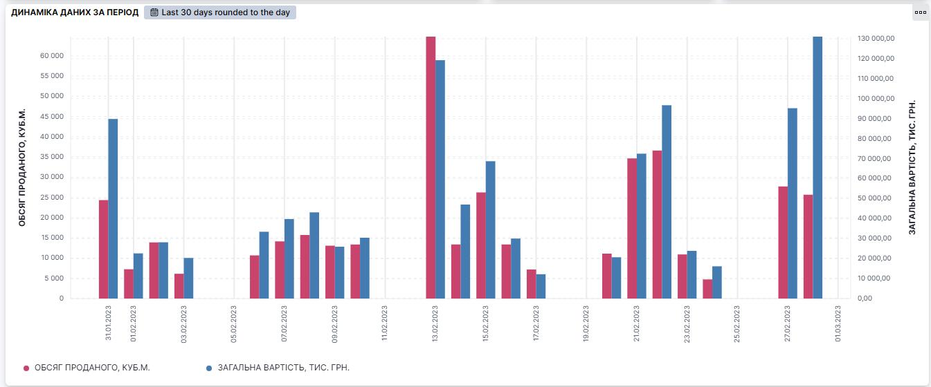 Аналітика на сайті УУБ дозволяє визначити обсяг реалізації круглих лісоматеріалів з кожної породи деревини. Так, наприклад, для сосни картина реалізації за останні 30 днів (з 30.01. до 28.02. 2023р.) виглядає так.