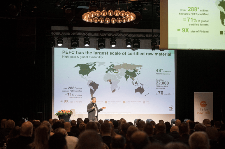 Михаэль Бергер, генеральный секретарь/генеральный директор PEFC, выступил на конференции Wood from Finland в Хельсинки в феврале. Wood from Finland — это национальная программа продвижения финских пиломатериалов, проводимая Business Finland и Финской ассоциацией лесопильных заводов. Фото: Вилма Иссакайнен / Ассоциация лесного хозяйства Финляндии