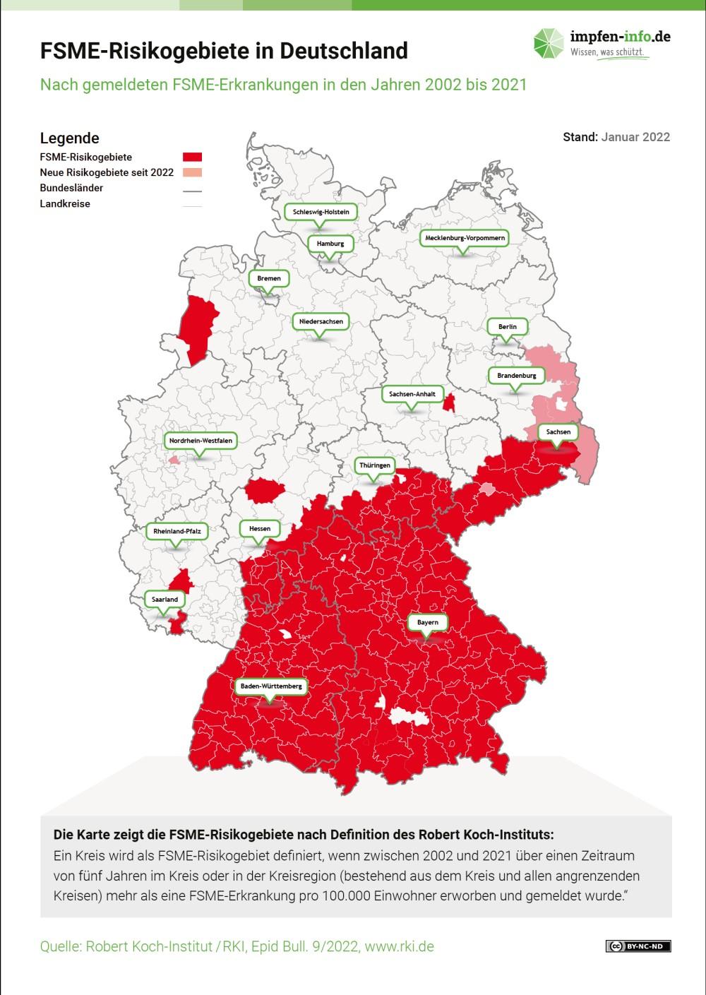 Институт Роберта Коха (RKI) определяет и публикует те районы как зоны риска, в которых есть данные о повышенном риске заражения из-за периодических случаев заболевания при контакте с клещами. Зоны риска КЭ до сих пор находились в южных регионах Баден-Вюртемберга и Баварии; но риск заражения от укуса клеща также увеличился в центре страны, а также в северной Германии. Текущая карта зон риска КЭ в Германии опубликована на сайте www.rki.de/fsme . TBE обычно проходит в 2 этапа: