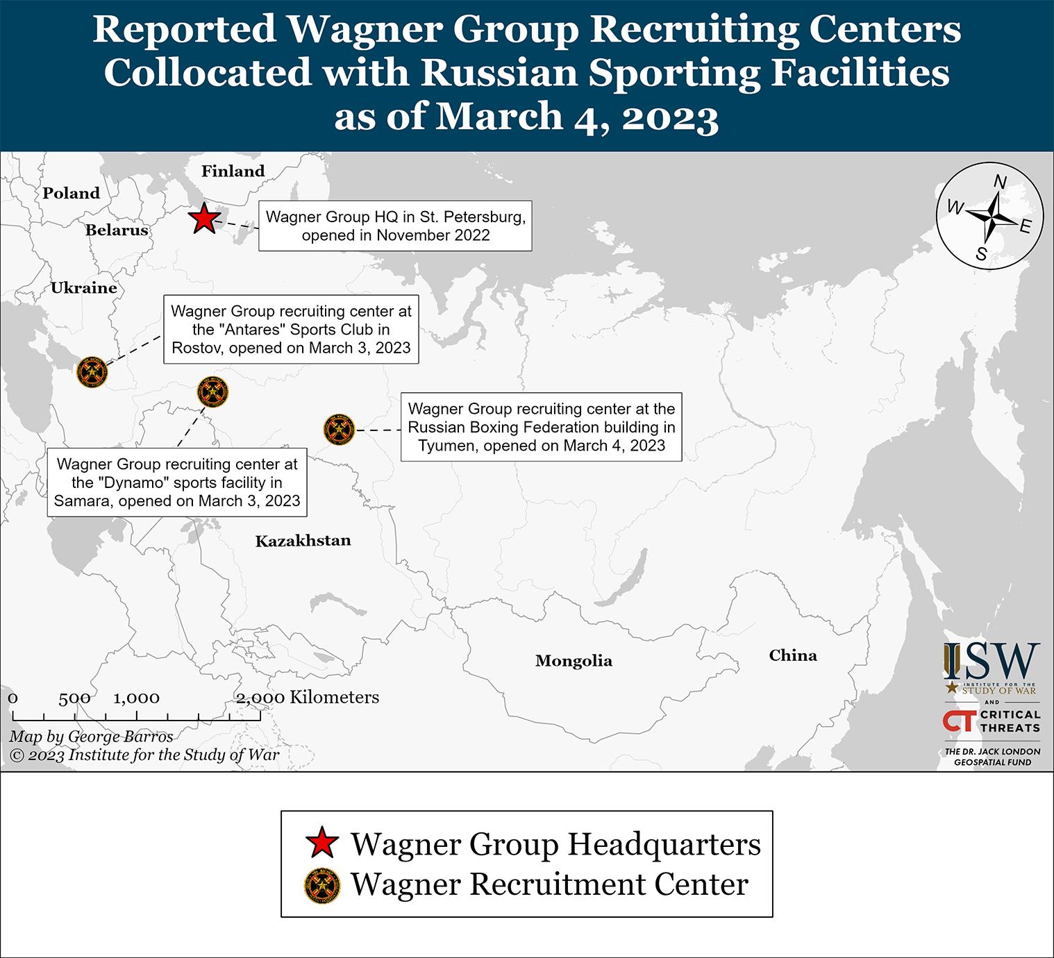 По сообщениям, группа Вагнера открыла по меньшей мере три новых вербовочных центра в российских спортивных клубах в период со 2 по 4 марта, возможно, чтобы увеличить вербовочную базу Вагнера после потери доступа к новобранцам. По сообщениям, группа Вагнера открыла по меньшей мере три новых рекрутинговых центра, связанных с российскими спортивными клубами, поскольку финансист группы Вагнера Евгений Пригожин официально объявил, что Вагнер начал вербовку через российский спортивный клуб 2 марта. Сообщается, что новые рекрутинговые центры Вагнера базируются на спортивном объекте «Динамо» в Самаре, спортивном клубе «Антарес» в Ростове и здании Федерации бокса России в Тюмени. Эти усилия могут быть направлены на то, чтобы компенсировать сокращение вербовки Вагнера после того, как группа Вагнера, как сообщается, потеряла доступ к вербовке заключенных в начале 2023 года. 3 марта Пригожин намекнул, что российские правительственные чиновники запретили группе Вагнера вербовать заключенных — так же, как Министерство обороны России саботировало поставки боеприпасов силам группы Вагнера. Пригожин объявил 9 февраля, что Вагнер полностью прекратил вербовку заключенных, но не охарактеризовал это как результат запрета российского правительства в то время. Российские СМИ также сообщили, что Вагнер открыл молодежный клуб «Вагнерёнок» в Санкт-Петербурге.