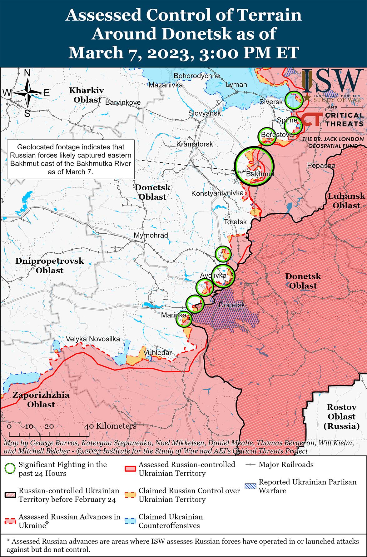 Российские войска, вероятно, захватили восточную часть Бахмута, к востоку от реки Бахмутки, после контролируемого ухода Украины из восточного Бахмута 7 марта. Российские войска продолжали наземные атаки в городе и вокруг него 7 марта. Геолоцированные кадры, опубликованные 6 и 7 марта, показывают российские позиции в восточной части Бахмута в пределах 200 м от реки Бахмутки и российские силы, комфортно действующие в районах восточного Бахмута, где они ранее не наблюдались, поддерживая предыдущие российские заявления о том, что российские войска захватили восточную часть Бахмута и что украинские войска отошли в центральный и западный Бахмут. Геолоцированные кадры, опубликованные 6 марта, дополнительно показывают продвижение России в юго-западном Бахмуте. Украинский Генеральный штаб сообщил, что российские войска продолжают попытки штурма Бахмута и что украинские войска отразили российские атаки на сам Бахмут; северо-восток Бахмута вблизи Федоровка (15 км к северо-востоку) и Белогоровка (20 км к северо-востоку); северо-запад Бахмута вблизи Дубово-Васильевки (6 км к северо-западу), Ягодного (1 км к северо-западу) и Зализянского (10 км к северо-западу); к западу от Бахмута вблизи Ивановское (5 км к западу) и к юго-западу от Бахмут вблизи Клещеевки (7 км к юго-западу). Российские источники утверждали, что украинские войска продолжают уходить на запад из Бахмута. Один милблогер отметил, что украинские войска ведут контратаки к юго-западу от Бахмута в районе трассы Т0504 Константиновка-Часов Яр-Бахмут для сохранения доступа к дороге. Финансист группы Вагнера Евгений Пригожин утверждал, что группа Вагнера убила 11 000 украинских солдат в Бахмуте в течение февраля, а другие российские источники также усилили заявления о высоких украинских потерях.
