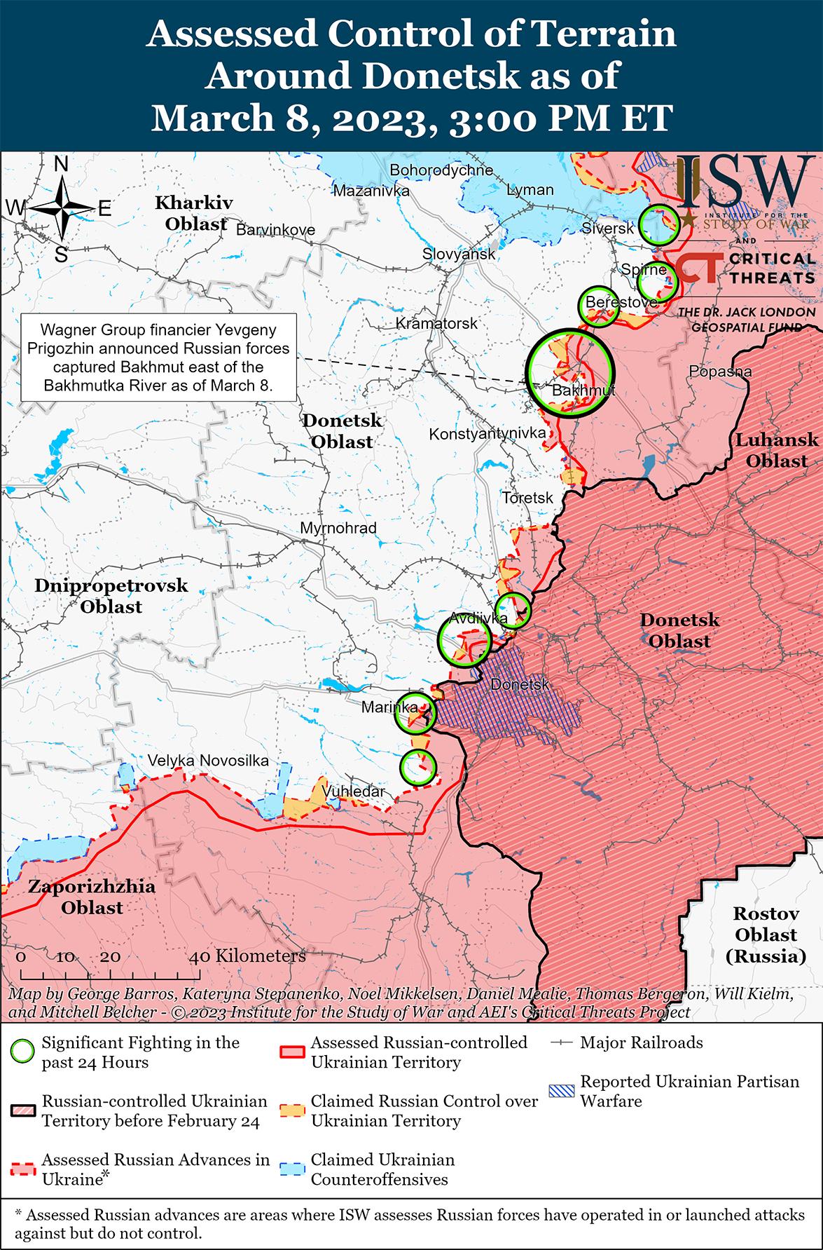 Финансист группы Вагнера Евгений Пригожин объявил 8 марта, что российские войска захватили весь восточный Бахмут, что согласуется с имеющимися визуальными доказательствами. По оценке ISW, 7 марта украинские войска завершили контролируемый отвод из восточного Бахмута через реку Бахмутка. Известный российский блогер утверждал, что российские войска контролируют от 45 до 52 процентов Бахмута по состоянию на 7 марта. Эта цифра является разумной; по оценкам ISW, по состоянию на 8 марта российские войска занимают не менее 50 процентов Бахмута. Российские войска, скорее всего, усилят атаки в северо-западном и юго-западном Бахмуте (к северу от Опытного и к югу от Ягодное, соответственно), чтобы обойти реку Бахмутку.