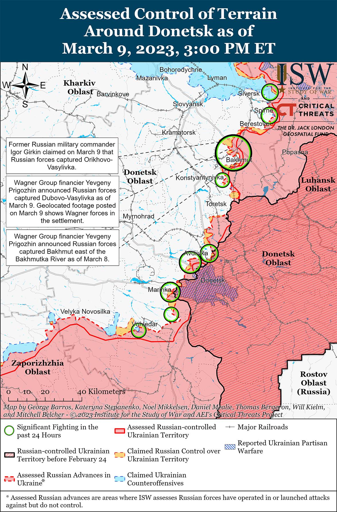 Российские войска продолжали наступательные операции в Бахмуте и вокруг него 9 марта, но не завершили обход или окружение города. Генеральный штаб Украины сообщил, что украинские войска отразили российские атаки возле Бахмута, в 11 км к северо-западу от Бахмута вблизи Орехово-Васильевки и Дубово-Васильевки и в 15 км к юго-западу от Бахмута вблизи Ивановского и Александро-Шультино. Финансист группы Вагнера Евгений Пригожин утверждал, что боевики группы Вагнера полностью захватили Дубово-Васильевку (6 км к северо-западу от Бахмута), а геолоцированные кадры, опубликованные 9 марта, указывают на то, что силы Вагнера, вероятно, захватили поселение. Пригожин добавил, что бои продолжаются на подступах к Дубово-Васильевке. Другой российский блогер утверждал, что боевики «Вагнера» и обычные российские войска совместно захватили Орехово-Васильевку (11 км к северо-западу от Бахмута), хотя ISW не видел никаких визуальных подтверждений этих утверждений. Геолоцированные кадры, опубликованные 8 марта, показывают, что российские войска обеспечили незначительные успехи в южном Бахмуте вдоль шоссе Т0513. Российские милблогеры утверждали, что боевики «Вагнера» совершали атаки в направлении западной части Бахмута, вблизи Богдановка (5 км к западу от Бахмута), на северные районы Бахмута от Ягодное (2 км к северу от Бахмута) и на южные районы Бахмута от Опытное (2 км к югу от Бахмута). Российский милблогер также утверждал, что украинские войска вели контратаки в восточной части Бахмута.