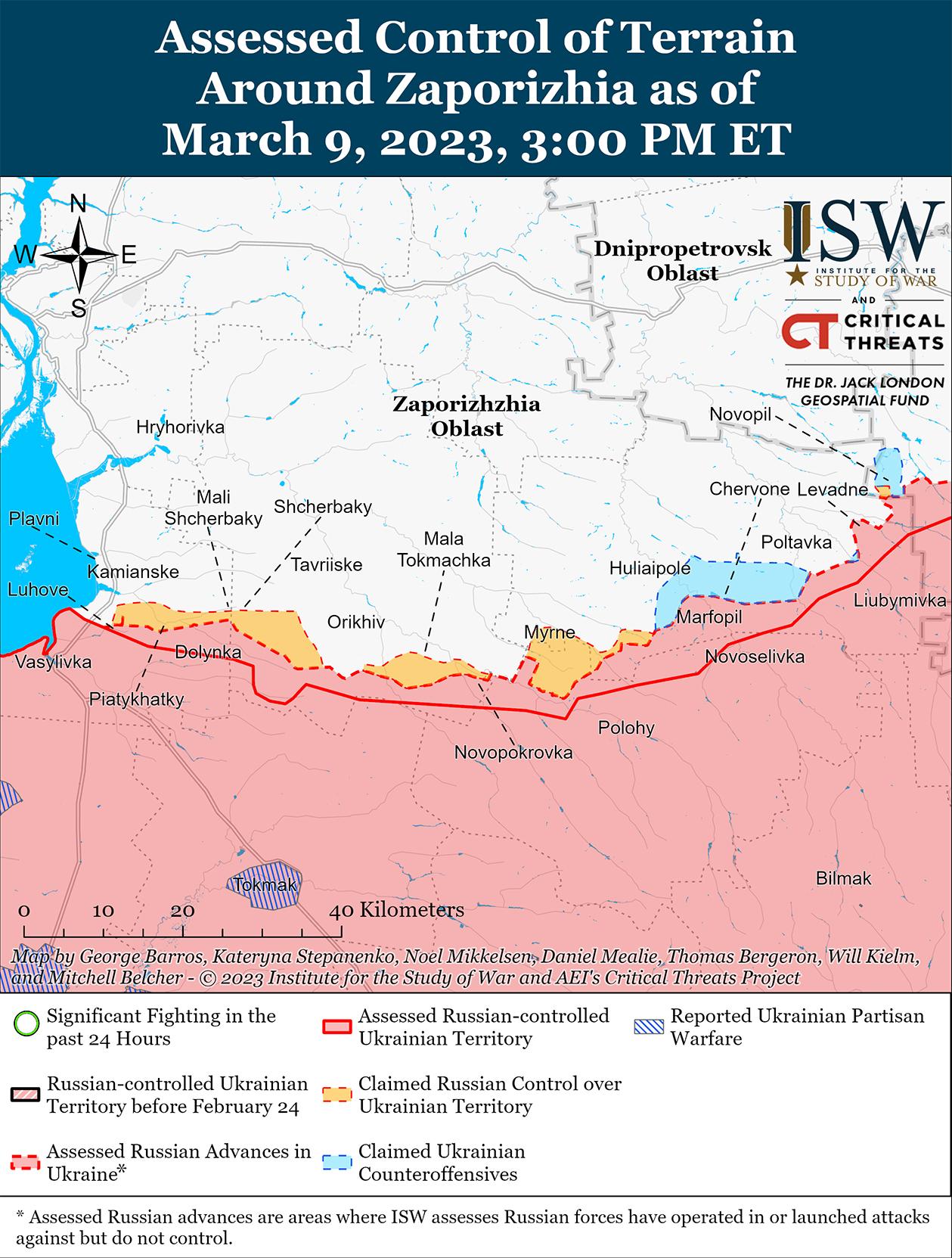 Российские власти, вероятно, активизируют усилия по вербовке на оккупированных украинских территориях. 9 марта украинские официальные лица сообщили, что российские оккупационные власти готовятся к весенней мобилизационной волне 2023 года в оккупированных районах Донецкой и Луганской областей и что местные военкоматы потребовали, чтобы учебные заведения представили списки всех мальчиков, родившихся в 2006 году, к 1 апреля. 6 марта ISW впервые сообщил, что украинские чиновники наблюдали случаи регистрации оккупационными властями подростков мужского пола, родившихся в 2006 году. Глава оккупации Запорожской области Евгений Балицкий также заявил 9 марта, что оккупационные власти начали формировать «Народную милицию Запорожья» («Народное ополчение», а не армейский корпус, как в оккупированных Донецкой и Луганской областях), якобы полностью добровольческий резерв нынешних и бывших жителей Запорожской области.