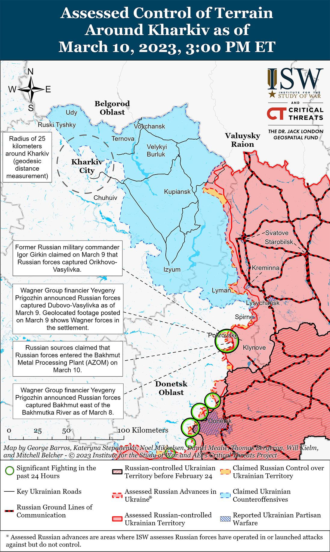 Российские войска добились успехов в Бахмуте и по состоянию на 10 марта зачищают восточные районы города. Геолоцированные кадры, опубликованные 10 марта, показывают, что российские войска продвинулись на новые позиции в северо-западном Бахмуте в пределах 800 метров от металлообрабатывающего завода AZOM. На новых кадрах с беспилотников, опубликованных 10 марта, видно, как российские солдаты выводят мирных жителей из зданий в восточной части Бахмута в неизвестное место под дулом пистолета, что указывает на то, что российские войска проводят операции по зачистке в восточной части Бахмута. Российские милблогеры широко утверждали, что силы группы Вагнера вошли в комплекс металлообрабатывающего завода AZOM на северо-западе Бахмута и продвигаются вглубь завода. Очевидное сосредоточение внимания на российском нападении на промышленную зону АЗОМ (сильно застроенный комплекс из нескольких зданий) указывает на то, что российские силы отдают приоритет лобовому нападению на укрепленные позиции в тактически сложной промышленной зоне вместо того, чтобы выбирать более широкое окружение западного Бахмута посредством атак на Хромово. Это нападение, вероятно, будет очень дорогостоящим для группы Вагнера.