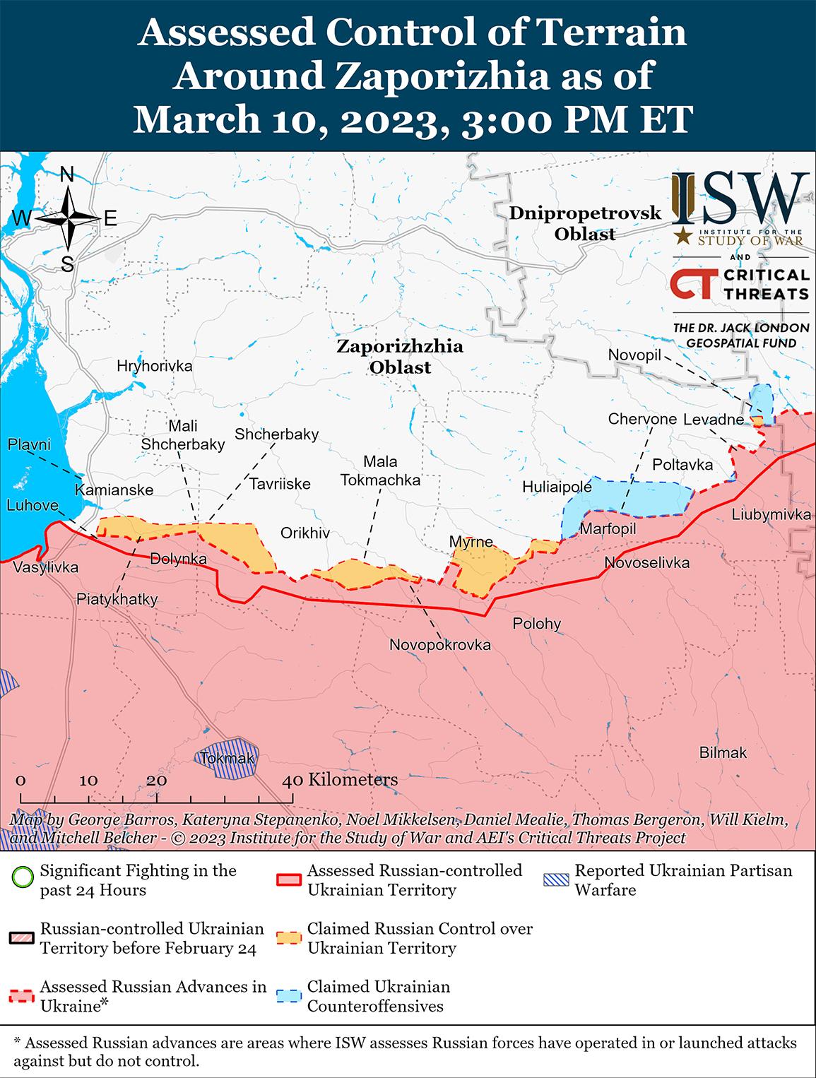Украинские источники сообщили, что российские чиновники планируют сформировать добровольческие формирования для усиления мобилизационных усилий в оккупированной Запорожской области. 10 марта Украинский центр сопротивления сообщил, что российские чиновники планируют сформировать запорожскую народную «Дружину», состоящую из добровольцев со всей России для «поддержания порядка» в оккупированной Запорожской области. Центр сопротивления оценил, что российские чиновники, скорее всего, проинструктируют добровольцев останавливать жителей на улице и собирать информацию для предстоящей мобилизационной волны в оккупированной Запорожской области. Мэр Мелитополя Украины Иван Федоров заявил 10 марта, что российские оккупационные власти готовятся к насильственной мобилизации жителей Запорожской области.