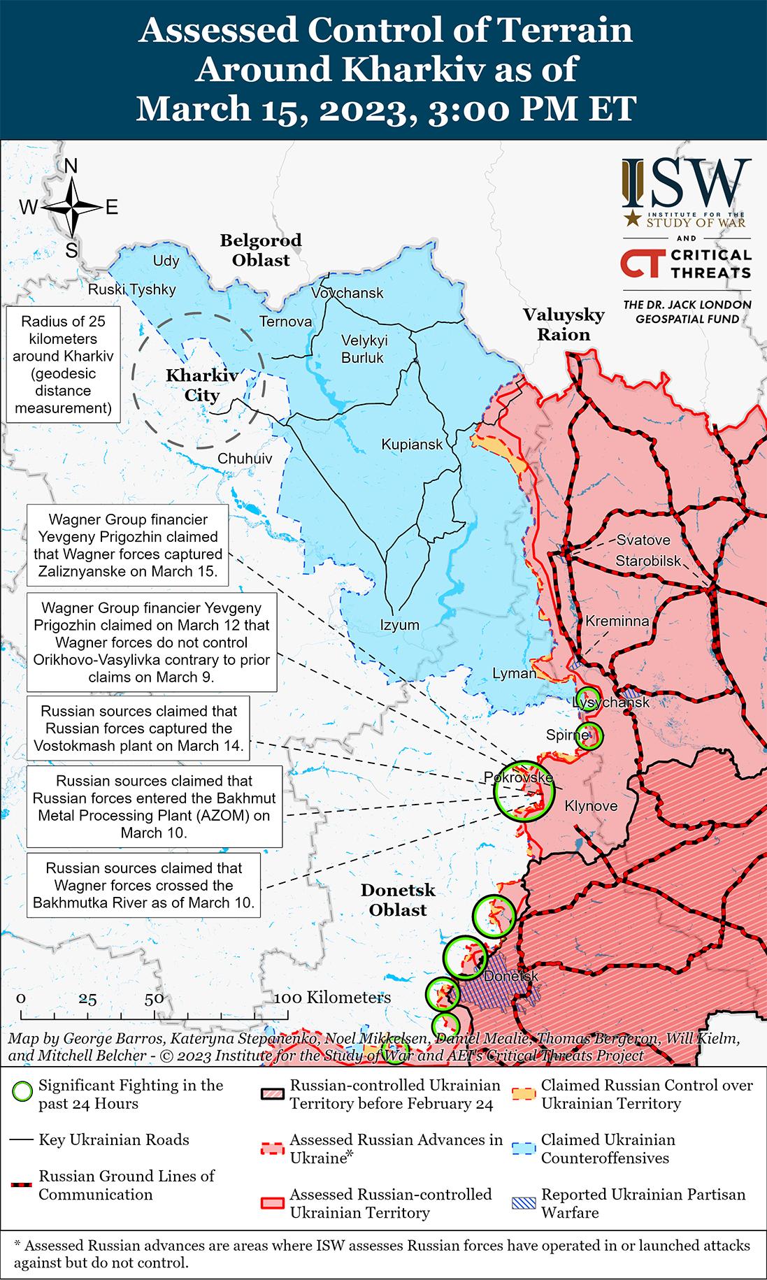 Российские войска продолжали наступление в Бахмуте и его окрестностях 15 марта. На геолоцированных кадрах, опубликованных 14 марта, видно, как силы группы Вагнера сражаются за новые позиции примерно в 4 км к северо-западу от Бахмута, что указывает на то, что Вагнер продвинулся к северо-западу от Бахмута в направлении линии Богдановка-Хромово. Геолоцированные кадры, опубликованные 15 марта, также показывают, что российские войска продвинулись к новым позициям в северном Бахмуте, к востоку от комплекса AZOM. Финансист группы Вагнера Евгений Пригожин утверждал, что бойцы «Вагнера» захватили Зализнянское (9 км к северо-западу от Бахмута) и «расширяют окружение Бахмута», которое было распространено многочисленными милблогерами. Российские милблогеры утверждали, что Вагнер сделал дополнительные постепенные продвижения к северо-западу от Бахмута вблизи Богдановки, Дубово-Васильевки и Орехово-Васильевки, и один милблогер предположил, что эти достижения могут позволить российским войскам открыть путь продвижения к Северску (примерно в 30 км к северо-востоку от Бахмута). Российские милблогеры также утверждали, что бойцы «Вагнера» продолжают воевать в тоннелях комплекса АЗОМ на севере Бахмута и продвинулись через улицу Корсунского в сторону Бахмутского индустриального колледжа на юге Бахмута. Российские источники сообщали о боях возле Ивановское (5 км к западу от Бахмута) и утверждали, что украинские войска контратакуют в этом районе. Один милблогер утверждал, что российские войска полностью покрывают трассу Бахмут-Хромово огнем ПТУР. Генеральный штаб Украины сообщил, что украинские войска отразили российские атаки к северо-западу от Бахмута вблизи Орехово-Васильевка (12 км к северо-западу), Ягодное (1 км к северо-западу) и Богдановка (6 км к северо-западу) и к западу от Бахмута вблизи Хромово (3 км к западу).