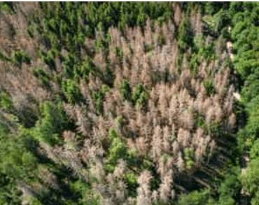 Лесопатологическое и санитарное состояние лесов еловой формации в 2022 году определяли главным образом неблагоприятные факторы окружающей среды (ураганные ветры, засушливые явления). Ослабление, повреждение и гибель еловых насаждений, вызванные данными факторами, способствовали формированию в них очагов вторичных стволовых вредителей с преобладанием короеда-типографа.