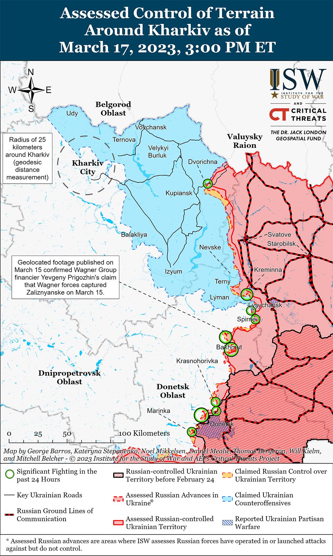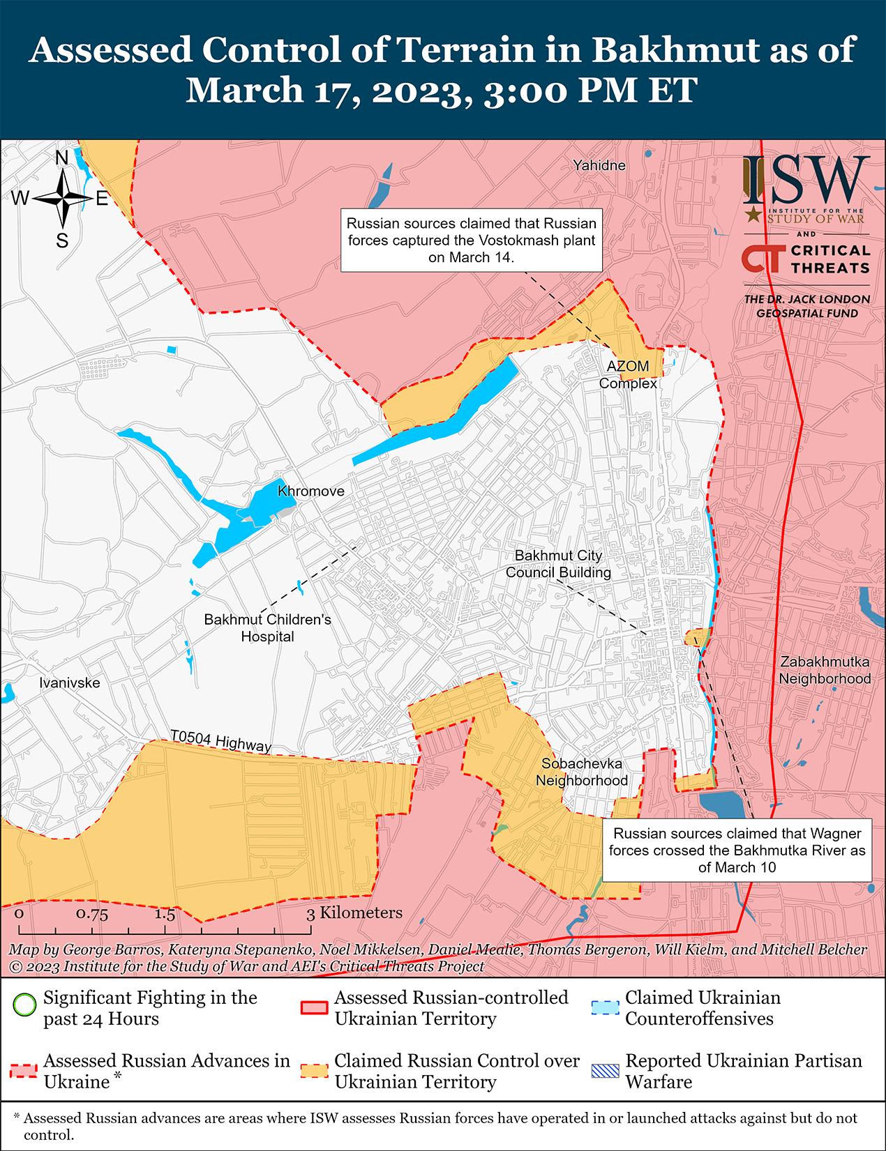 Российские войска продолжили наступательные операции в Бахмуте и его окрестностях 17 марта. Генеральный штаб Украины сообщил, что украинские войска отразили российские атаки возле Бахмута, в 11 км к северо-западу от Бахмута вблизи Орехово-Васильевки и Григоровки и в 6 км к юго-западу от Бахмута вблизи Ивановского и Клещиевки. Российские миблогеры утверждали, что боевики группы Вагнера атаковали украинские позиции вблизи Хромово (2 км к западу от Бахмута) и Богдановка (6 км к западу от Бахмута). Геолоцированные кадры, опубликованные 17 марта, показывают, что российские войска обеспечили незначительные успехи в северном Бахмуте. Глава Донецкой Народной Республики (ДНР) Денис Пушилин заявил, что российские войска продвинулись вглубь комплекса АЗОМ на севере Бахмута, хотя ISW не зафиксировал визуального подтверждения того, что российские войска действуют на территории комплекса. Государственная пограничная служба Украины сообщила, что украинские войска вели бой с боевиками «Вагнера» в промышленной зоне в Бахмуте, но не уточнила, был ли это комплекс АЗОМ. Российские милблогеры утверждали, что российские войска продолжали наступление в южных районах Бахмута и что боевики Вагнера достигли шоссе Т0504 на юго-западной окраине Бахмута и перерезали украинскую линию снабжения. На момент публикации ISW не наблюдал визуального подтверждения того, что силы группы Вагнера перехватили трассу Т0504 на южной окраине Бахмута. Украинские силы в Бахмуте по-прежнему смогут получить доступ к участкам трассы Т0504 через проселочные дороги между Хромовым и Ивановским, даже если нынешние российские претензии верны.