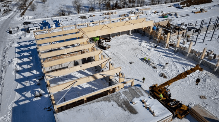 В производственной части здания комплекса сортировки и переработки рассады возводятся большепролетные клееные деревянные конструкции, длина которых достигает 30 метров.