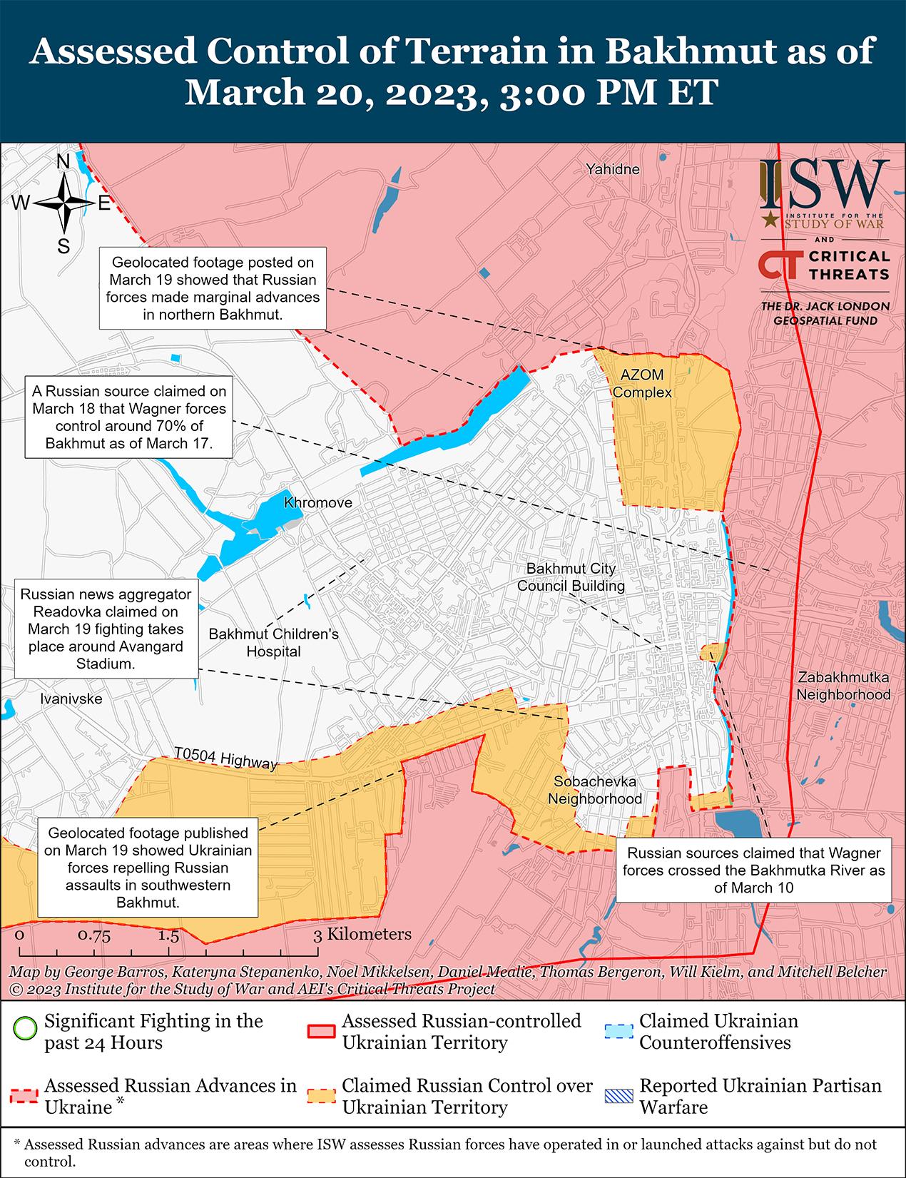 Российские войска продолжали наступление в Бахмуте и его окрестностях 19 и 20 марта. Геолоцированные кадры, опубликованные 19 марта, показывают, что российские войска продвинулись в юго-западном Бахмуте к югу от улицы Корсунского, примерно в 7 км к северо-западу от Бахмута между Богдановкой и Хромовым, а также в северном Бахмуте вблизи комплекса АЗОМ. Геолоцированные кадры, опубликованные 20 марта, также указывают на то, что силы Вагнера продвинулись вблизи Мариупольского кладбища на юго-западе Бахмута. Финансист группы Вагнера Евгений Пригожин 20 марта заявил, что Вагнер контролирует 70 процентов Бахмута. 19 марта российский милблогер заявил, что силы группы Вагнера ведут бои в пяти точках вдоль трассы Т0504 Константиновка-Часов Яр-Бахмут и продвигаются к самой дороге. Российские милблогеры также утверждали, что Вагнер добился успехов к северо-западу от Бахмута в районе Орехово-Васильевки (10 км к северо-западу от Бахмута) и в направлении Новомарково (14 км к северо-западу от Бахмута) в период с 19 по 20 марта. Несколько российских источников сообщили, что Вагнер также продвинулся в центральном и юго-западном Бахмуте и ведет бои на стадионе «Авангард», в 800 метрах от здания администрации города Бахмут. Российские источники, по-видимому, обеспокоены перспективой украинских контратак в Бахмуте, а некоторые утверждали, что украинские войска накапливаются к западу от Бахмута вблизи Константиновки и Часового Яра. 19 и 20 марта Украинский Генеральный штаб сообщил, что украинские войска отразили российские атаки на сам Бахмут; к северо-западу от Бахмута вблизи Орехово-Васильевки, Богдановка (6 км к северо-западу) и Григоровка (10 км к северо-западу); и к западу от Бахмута вблизи Ивановское (5 км к западу).