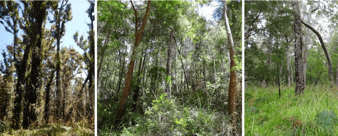 Итак, что мы нашли? По мере того, как подлесок в эвкалиптовом лесу стареет и редеет, нижние ветви более высоких растений «самоподрезаются» — другими словами, сбрасывают мертвые листья и ветки.