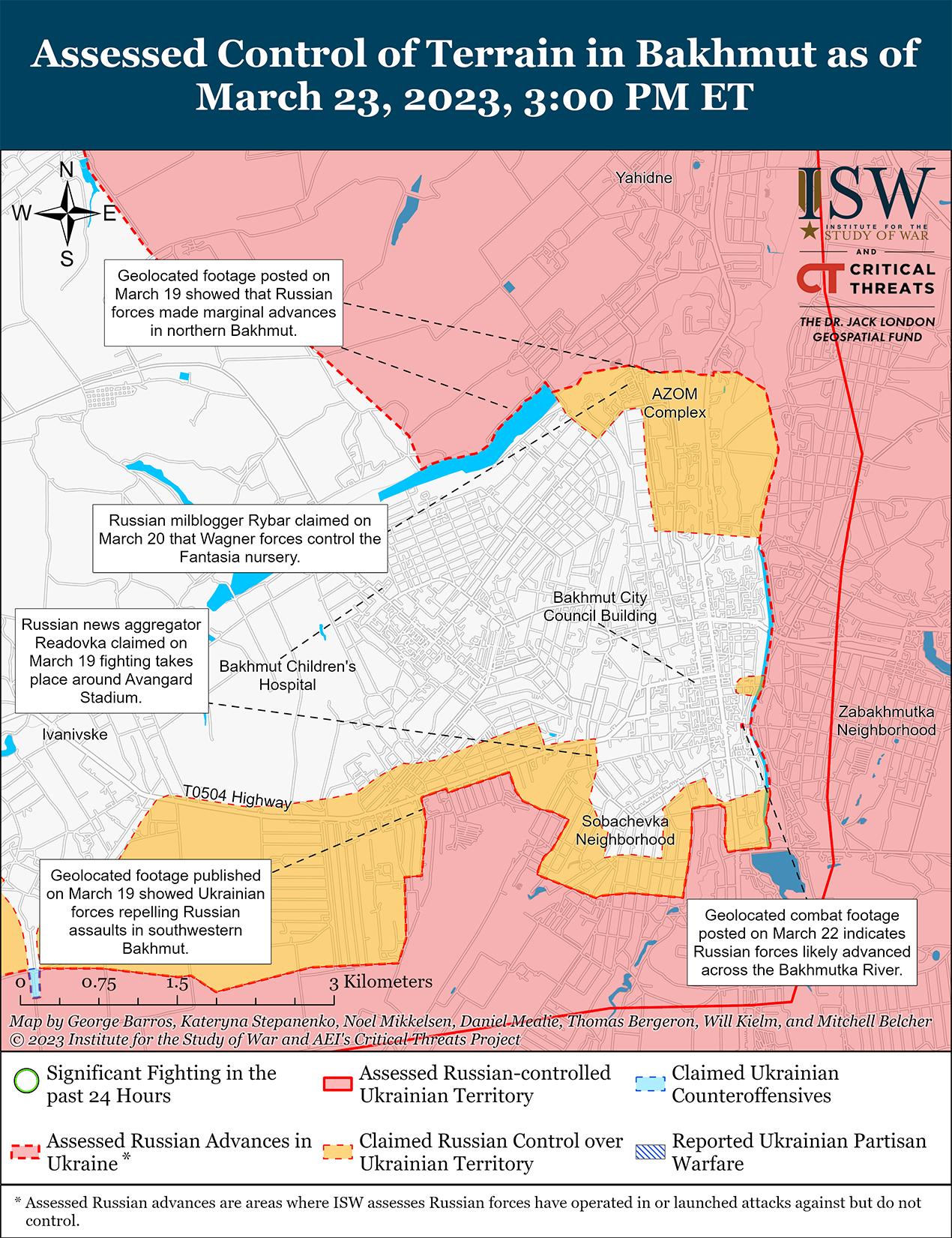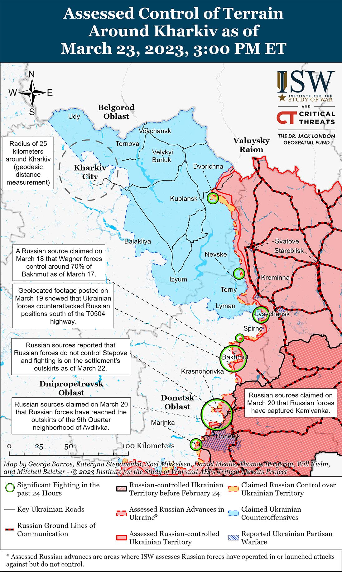 Российские войска продолжали атаковать город Бахмут и его окрестности 23 марта. Командующий Сухопутными войсками Украины Александр Сырский заявил, что элементы группы Вагнера остаются основной российской силой, действующей на Бахмутском направлении, и что они еще не утратили своих наступательных возможностей. Сырский отметил, что, хотя силы Вагнера по-прежнему имеют численное преимущество на линии фронта, украинские силы продолжают истощать наемников, что позволит украинским силам проводить неопределенные будущие наступательные операции. Пресс-секретарь Восточной группы вооруженных сил Украины полковник Сергей Череватый заявил, что российские и украинские силы 35 раз вступали в контакты на всей линии фронта в Бахмуте, 29 из которых произошли в городе или его ближайших окрестностях. Украинский Генеральный штаб сообщил, что в Бахмуте ведутся постоянные позиционные бои и что украинские войска отразили российские атаки к северо-западу от Бахмута в Александро-Шультино и Богдановке; северо-восточнее Бахмута в Васюковке; и южнее Бахмута в Предтечино. Российские источники также утверждали, что российские войска полностью очистили промышленную зону на севере Бахмута и продолжают воевать в центральном и южном Бахмуте. Российские милблогеры утверждали, что боевые действия продолжаются к юго-западу от Бахмута в Ивановском и что наемники Вагнера нападают на Крахмальное к северо-западу от Бахмута. Геолоцированные кадры, опубликованные 22 марта, показали, что украинские силы вступают в бой с находящимися неподалеку российскими силами на западном берегу реки Бахмутки с применением стрелкового оружия, что, вероятно, указывает на то, что некоторые россияне перешли реку вброд.
