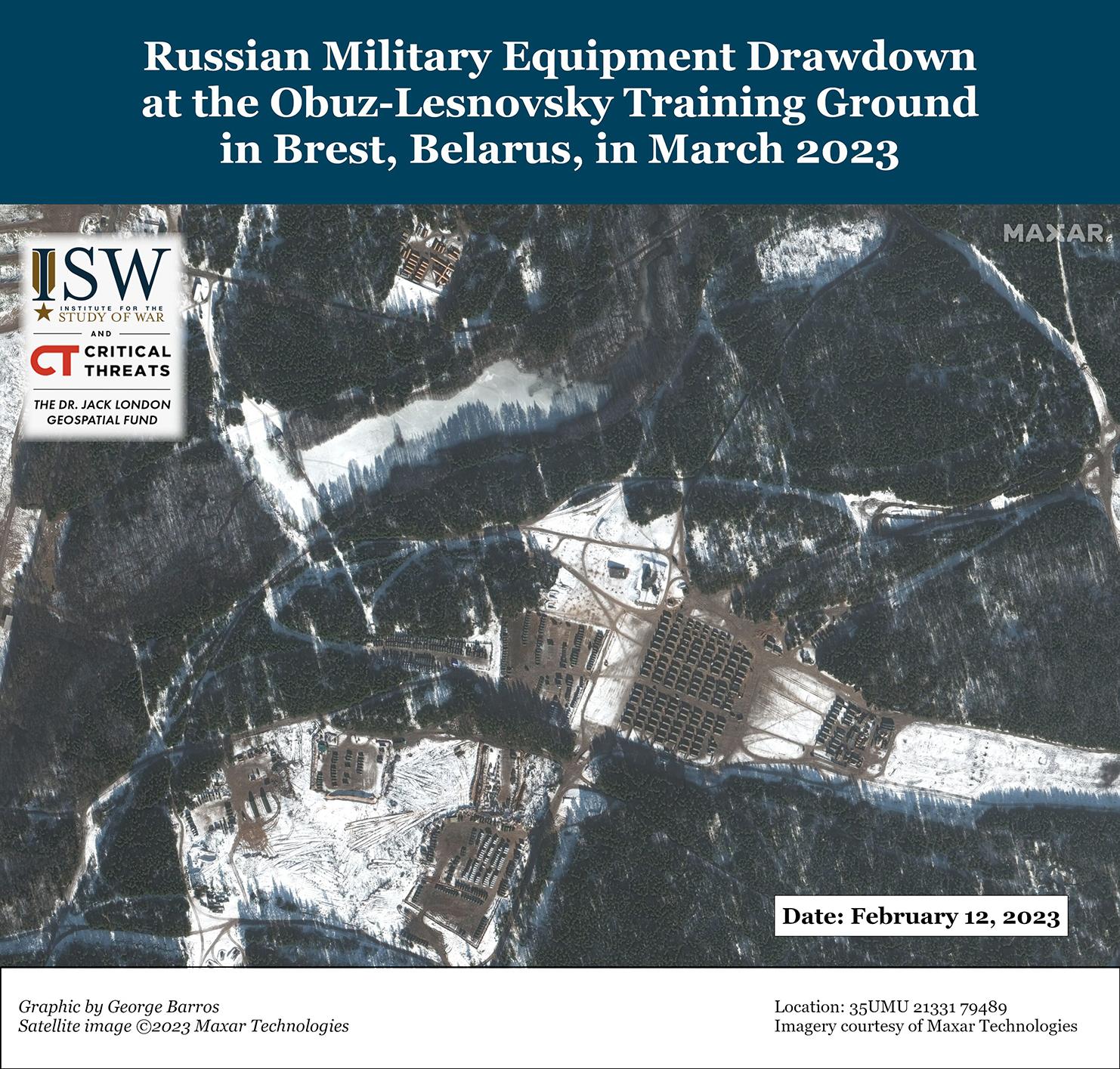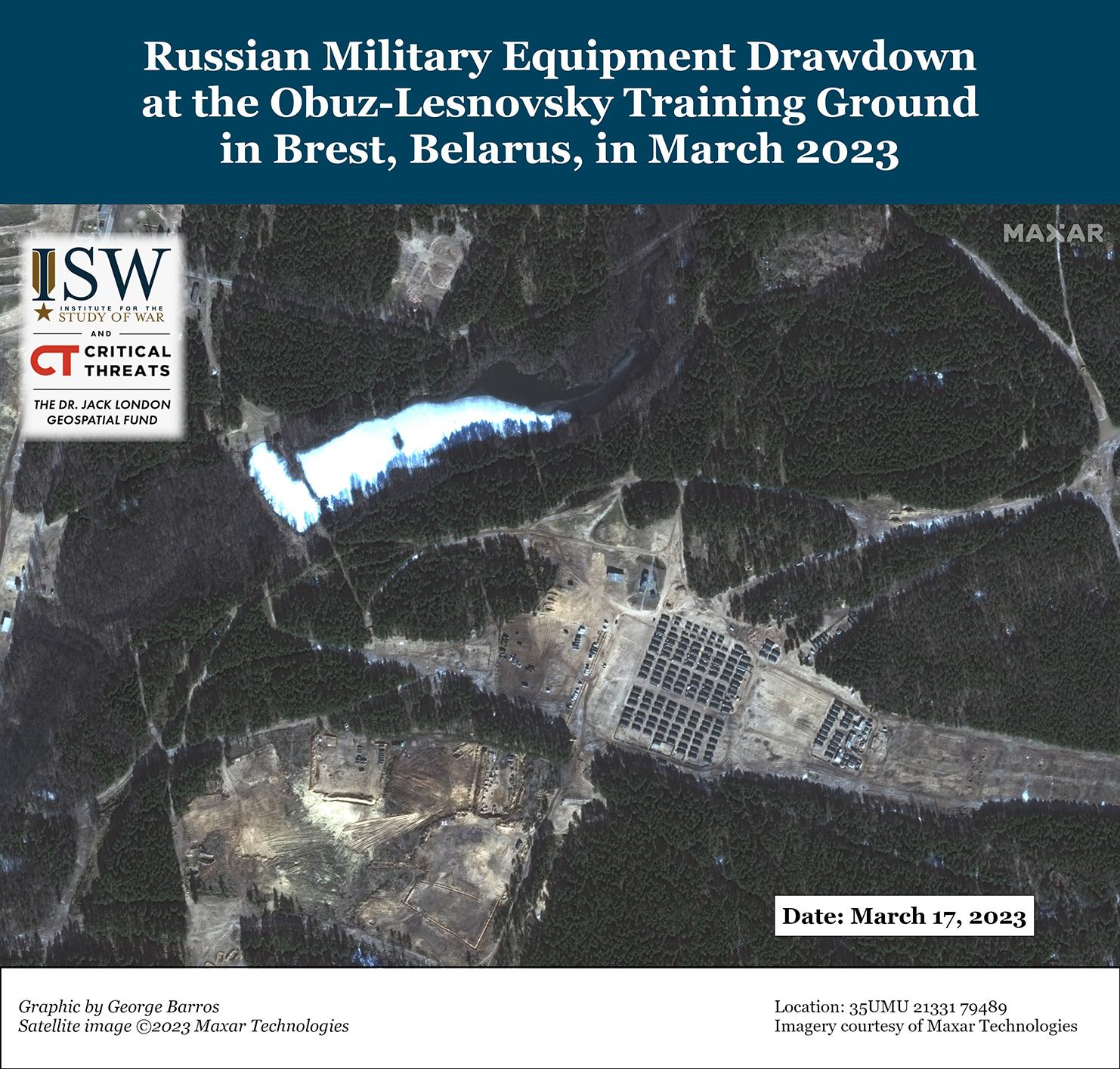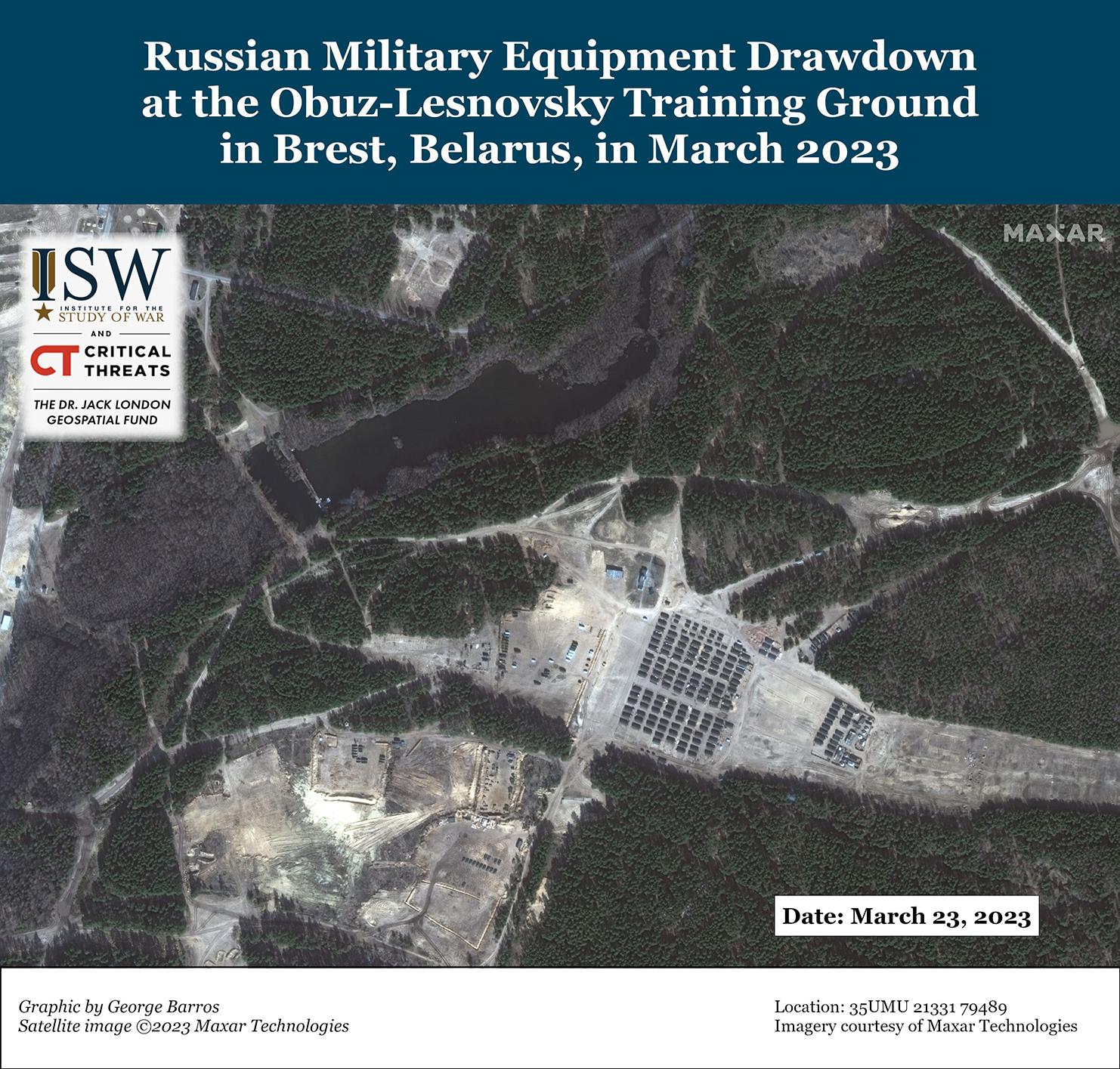 Российские войска в Беларуси недавно передислоцировались обратно в Россию в преддверии весеннего призыва на военную службу в России 1 апреля. Коммерческие спутниковые снимки, собранные 17 и 23 марта, показывают, что значительные российские элементы, ранее развернутые на 230-м общевойсковом полигоне Обуз-Лесновский в Бресте, Беларусь, больше не находятся на полигоне. Спутниковые снимки, собранные 12 февраля, показывают оборудование на месте. Представитель Главного управления разведки Украины (ГУР) Вадим Скибицкий заявил 23 марта, что в настоящее время в Беларуси находится около 4 200 российских военнослужащих, что указывает на сокращение. В конце 2022 года в Беларуси было развернуто около 12 000 военнослужащих. Пресс-секретарь Пограничной службы Украины Андрей Демченко ранее заявил 4 марта, что численность российских сил в Беларуси колеблется, но в целом не превышает 9 000 – 10 000 человек в любой момент времени. Демченко заявил, что замещающие российские силы, скорее всего, будут развернуты в Беларуси после передислокации российских войск из Беларуси, сохраняя общую численность российского персонала в Беларуси более или менее равной с течением времени. Эти российские силы, вероятно, были развернуты обратно в Россию, чтобы высвободить белорусские учебные мощности в преддверии весеннего призывного цикла в России. Российские войска могут направить больше мобилизованных сил или, возможно, призывников для обучения в Беларуси, учитывая, что многие из палаток на полигоне остались на месте на недавних спутниковых снимках. Россия, скорее всего, сохранит постоянные вооруженные силы в Беларуси в связи с продолжающимся развертыванием учебных мероприятий; Скибицкий также заявил, что российские войска оставили батарею «Искандер» в Беларуси.