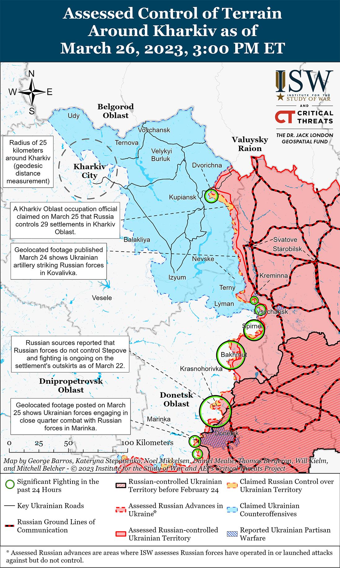 ISW публикует сокращенное обновление кампании сегодня, 26 марта. В этом докладе обсуждаются продолжающиеся усилия президента России Владимира Путина по достижению полной победы в Украине, которую он, похоже, уверен, что сможет достичь со временем. Путин, похоже, отвергает все более распространенную в западном дискурсе идею о том, что нынешние военные реалии требуют или поддерживают урегулирование конфликта путем переговоров. Ни Украина, ни Запад не убедили его в том, что он должен рассмотреть вопрос о принятии какого-либо компромиссного или компромиссного урегулирования. Вместо этого Путин по-прежнему сосредоточен на достижении своих первоначальных военных целей через затяжной конфликт, в котором он побеждает, либо навязывая свою волю Украине силой, либо нарушая волю Украины после того, как Запад оставит Киев. Многочисленные успешные украинские контрнаступления почти наверняка необходимы, но недостаточны ни для того, чтобы убедить Путина вести переговоры на приемлемых условиях, ни для создания военных условий на местах, достаточно благоприятных для Украины и Запада, где продолжающиеся или возобновленные российские атаки представляют приемлемую угрозу для Украины или НАТО.