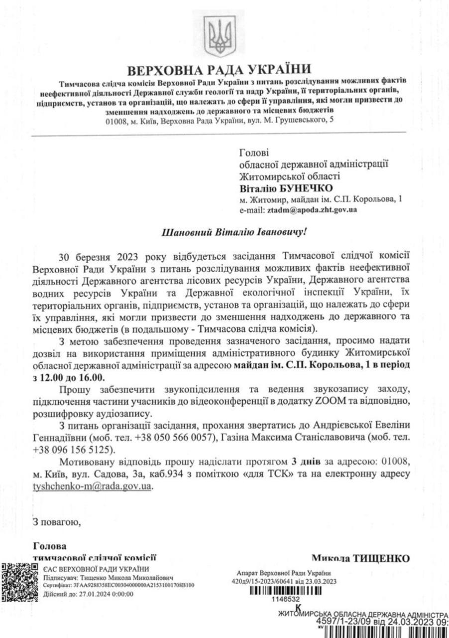 Редакція “Відкритого лісу” отримала копію листа народного депутата голови ТСК Миколи Тищенка на адресу Голови Житомирської ОДА Віталія Бунечко.