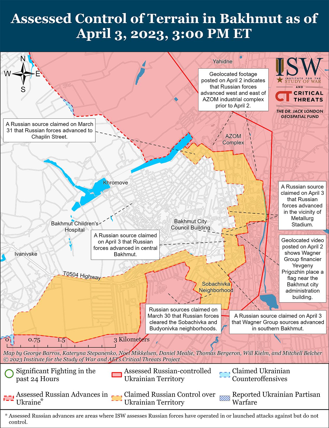 Бойцы группы Вагнера продолжили наступление в центре Бахмута и в ночь на 2 апреля захватили здание администрации города Бахмута. Финансист группы Вагнера Евгений Пригожин в ночь на 2 апреля поднял российский флаг с надписью в память об убитом милблогере Максиме Фомине напротив здания администрации города Бахмут и заявил, что Вагнер «юридически контролирует» Бахмут, хотя украинские войска остаются в западной части города. Российские войска продвинулись вперед 3 апреля, а 3 апреля были опубликованы кадры с беспилотников, на которых изображена группа Вагнера и российские флаги, установленные над обломками разрушенного административного здания. Несколько российских милблогеров дополнительно распространили изображение бойца Вагнера, стоящего перед зданием администрации города Бахмут перед его разрушением. Группа Вагнера, вероятно, продолжит попытки консолидировать контроль над центральным Бахмутом и попытается продвинуться на запад через густонаселенные городские районы к Хромову.