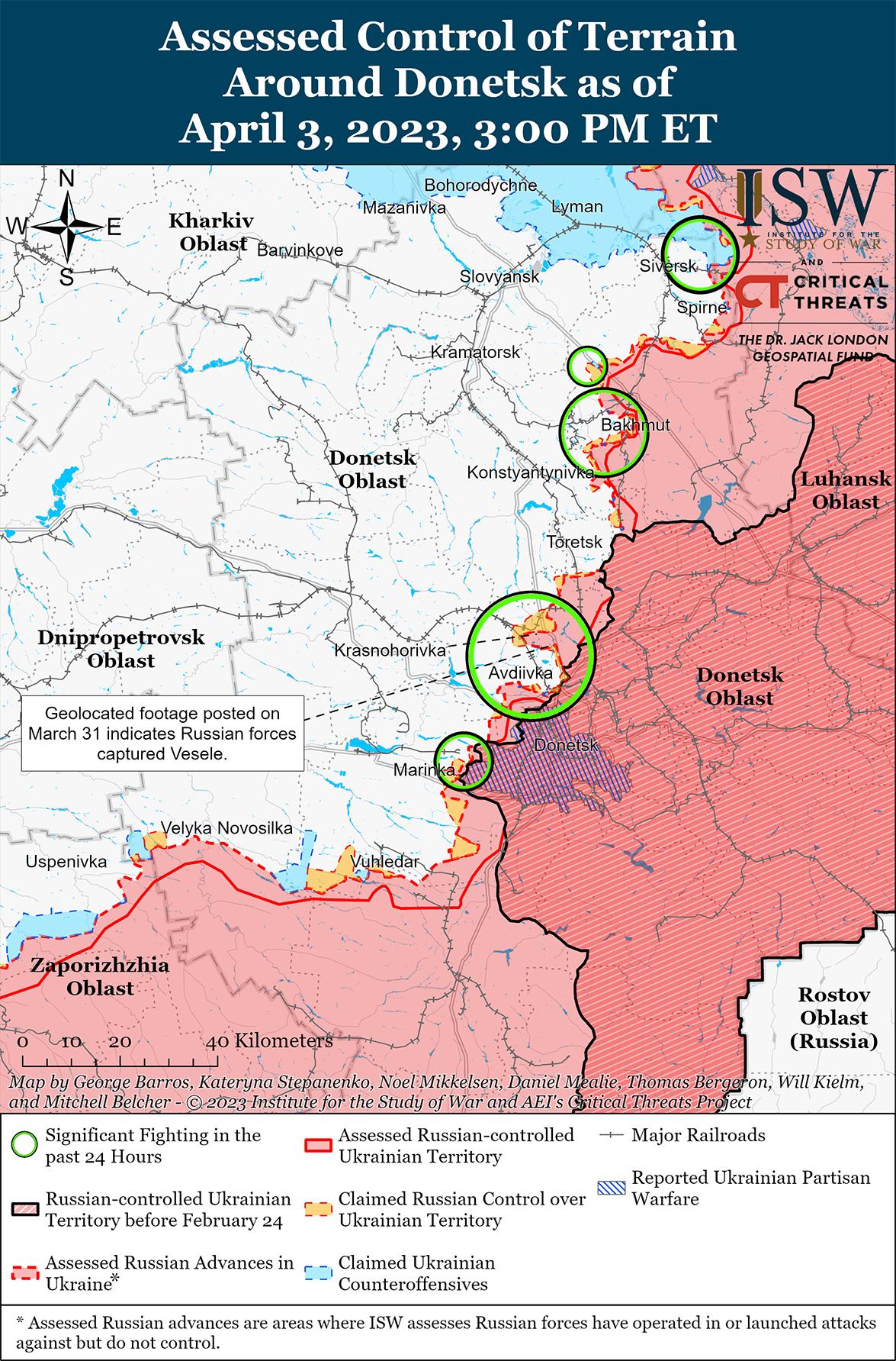 Силы группы Вагнера продолжали наступление в центре Бахмута 2 и 3 апреля. Геолоцированные кадры, опубликованные 1 апреля, показывают украинский ракетный удар по российским позициям в комплексе AZOM на севере Бахмута, подтверждая, что группа Вагнера, вероятно, захватила комплекс около 28 марта, как ранее сообщал ISW. Геолоцированные кадры, снятые в ночь на 2 апреля, на которых финансист группы Вагнера Евгений Пригожин поднимает российский флаг перед зданием администрации города Бахмут. Несколько милблогеров дополнительно распространили изображение бойца Вагнера, стоящего перед дверью офиса в самом здании Администрации города Бахмут. 2 и 3 апреля российские милблогеры заявили, что силы Вагнера продолжают укреплять контроль над улицами и городскими районами вблизи центра Бахмута и что тяжелые бои продолжаются к юго-западу от Бахмута в районе Ивановского сектора шоссе Т0504 Константиновка-Часов Яр-Бахмут. Несколько российских источников утверждали, что украинские войска отводятся в западную часть города. 2 и 3 апреля Генеральный штаб Украины сообщил, что украинские войска продолжают отражать российские атаки на сам Бахмут, к северо-западу от Бахмута возле Орехово-Васильевки (12 км к северо-западу) и к юго-западу от Бахмута вблизи Ивановское (5 км к юго-западу) и Предтечино (15 км к юго-западу). Украинские военные поддержали оценку ISW о том, что российские воздушно-десантные войска (ВДВ) все чаще поддерживают операции Вагнера в Бахмуте.
