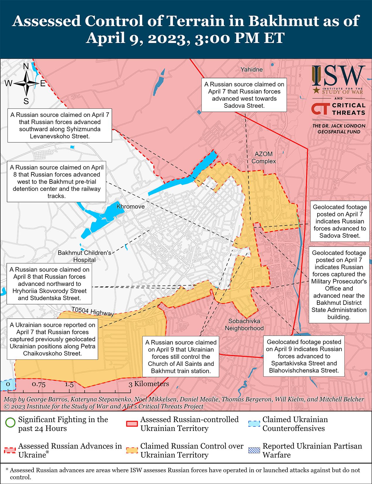 - Российские войска продолжали проводить наземные атаки в Бахмуте и его окрестностях, а также на линии Авдеевка-Донецк. Череватый заявил, что в Бахмуте появились российские воздушно-десантные войска (ВДВ). Российские войска, вероятно, добились незначительных успехов на юге Бахмута 9 апреля.