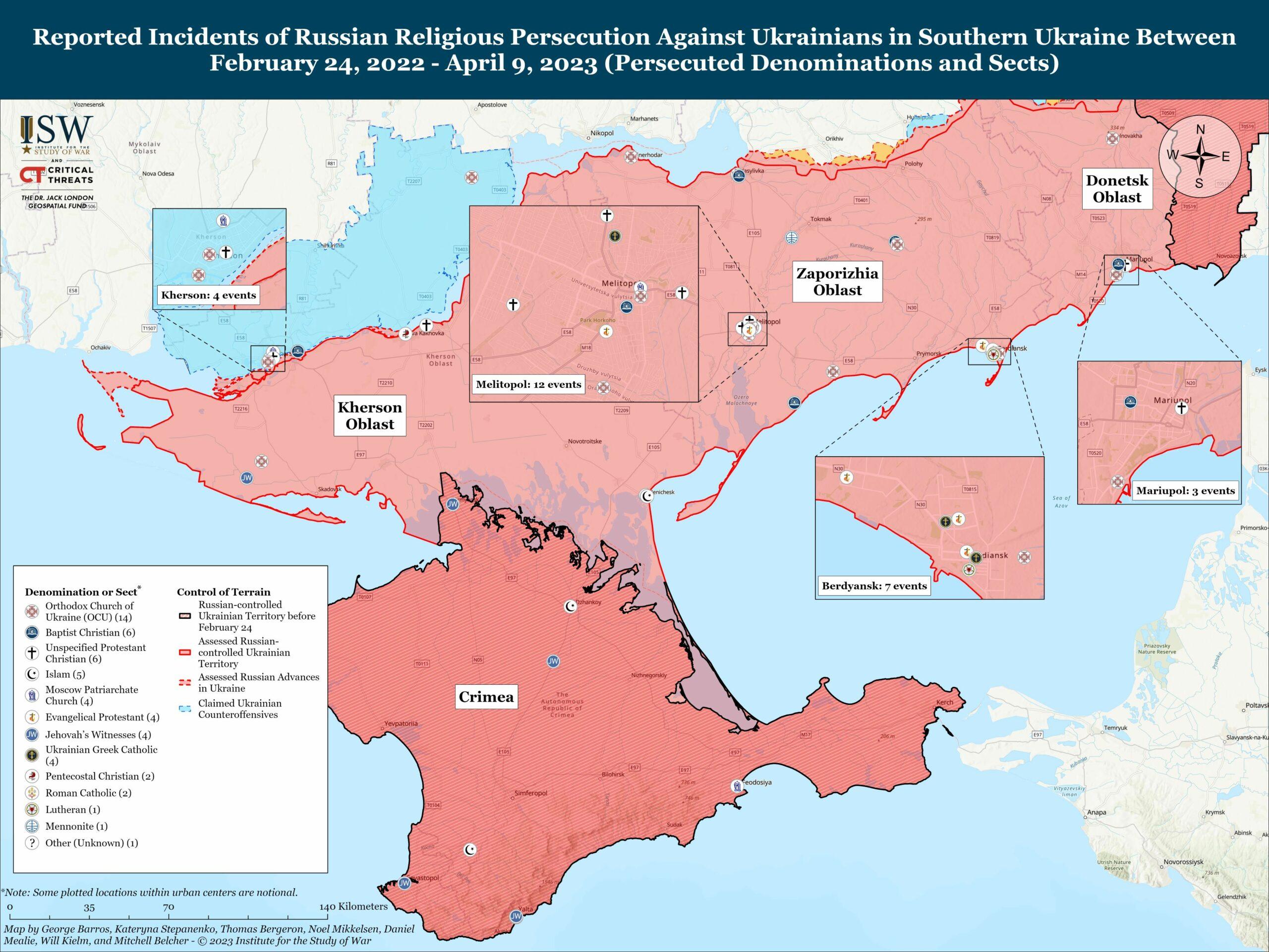 Это исследование содержит лишь небольшую часть всех зарегистрированных в России религиозных преследований в отношении религиозных групп в Украине. ISW не включал события, в которых непрямой огонь мог непреднамеренно убить религиозных лидеров или разрушить места отправления культа. (Этот отчет, в частности, не включает все 494 религиозных здания, которые, как сообщается, российские военные полностью разрушили, повредили или разграбили, по данным независимого киевского Института религиозной свободы по состоянию на февраль 2023 года, потому что ISW не может оценить преднамеренность во всех этих случаях, например.) События, включенные в данное исследование, взяты из сообщений о том, что российские войска – обычно пехота, сотрудники службы безопасности или оккупационные чиновники – намеренно принуждают религиозные группы. Этот доклад также исключает многие случаи российских религиозных репрессий в районах, которые российские войска оккупировали с весны 2014 года по 24 февраля 2022 года, чтобы сосредоточиться на более поздних преследованиях в недавно оккупированных районах.