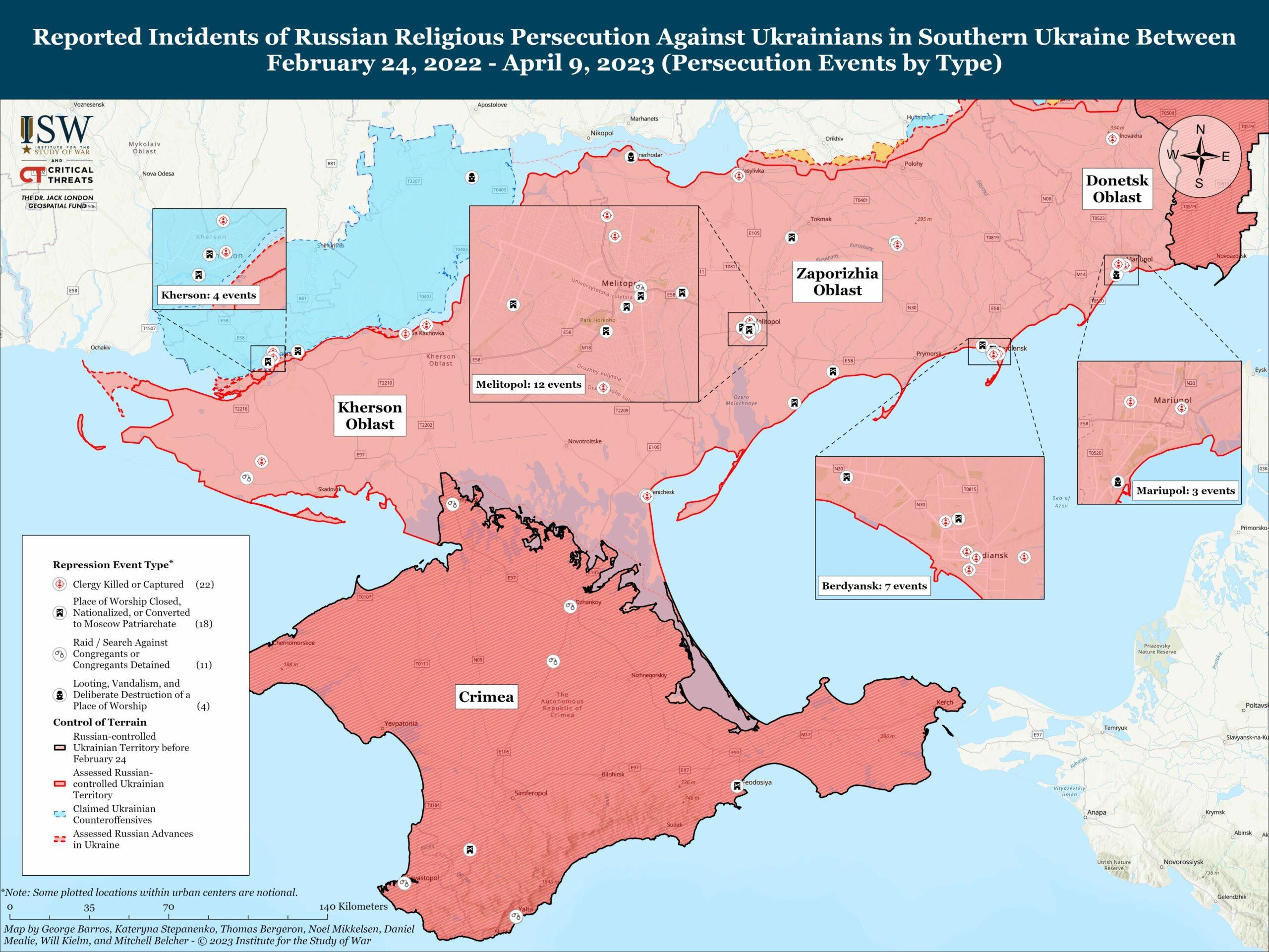 Систематические религиозные преследования в России поддерживают более масштабную российскую кампанию культурного геноцида против Украины. ISW ранее оценивал, что Россия проводит массовую депортацию украинских детей и обезлюдивание украинской территории, что, вероятно, равносильно преднамеренной кампании этнической чистки. ISW считает, что эта кампания этнической чистки является частью более масштабной кремлевской кампании культурного геноцида, направленной на искоренение понятия уникальной украинской культурной идентичности. Этническая чистка не квалифицируется как преступление в соответствии с международным правом, однако Комиссия экспертов Организации Объединенных Наций охарактеризовала этническую чистку как «целенаправленную политику, разработанную одной этнической или религиозной группой с целью изгнания насильственными и подстрекающими к террору средствами гражданского населения другой этнической или религиозной группы из определенных географических районов. Конвенция о предупреждении преступления геноцида и наказании за него провозглашает, что геноцид включает в себя «действия, совершенные с намерением уничтожить, полностью или частично, национальную, этническую, расовую или религиозную группу». Это определение согласуется с нынешними усилиями России по ликвидации «нежелательных» украинских религиозных групп на оккупированных украинских территориях. Преднамеренные нападения и вандализм России на места отправления культа в оккупированной Украине также могут представлять собой военные преступления.