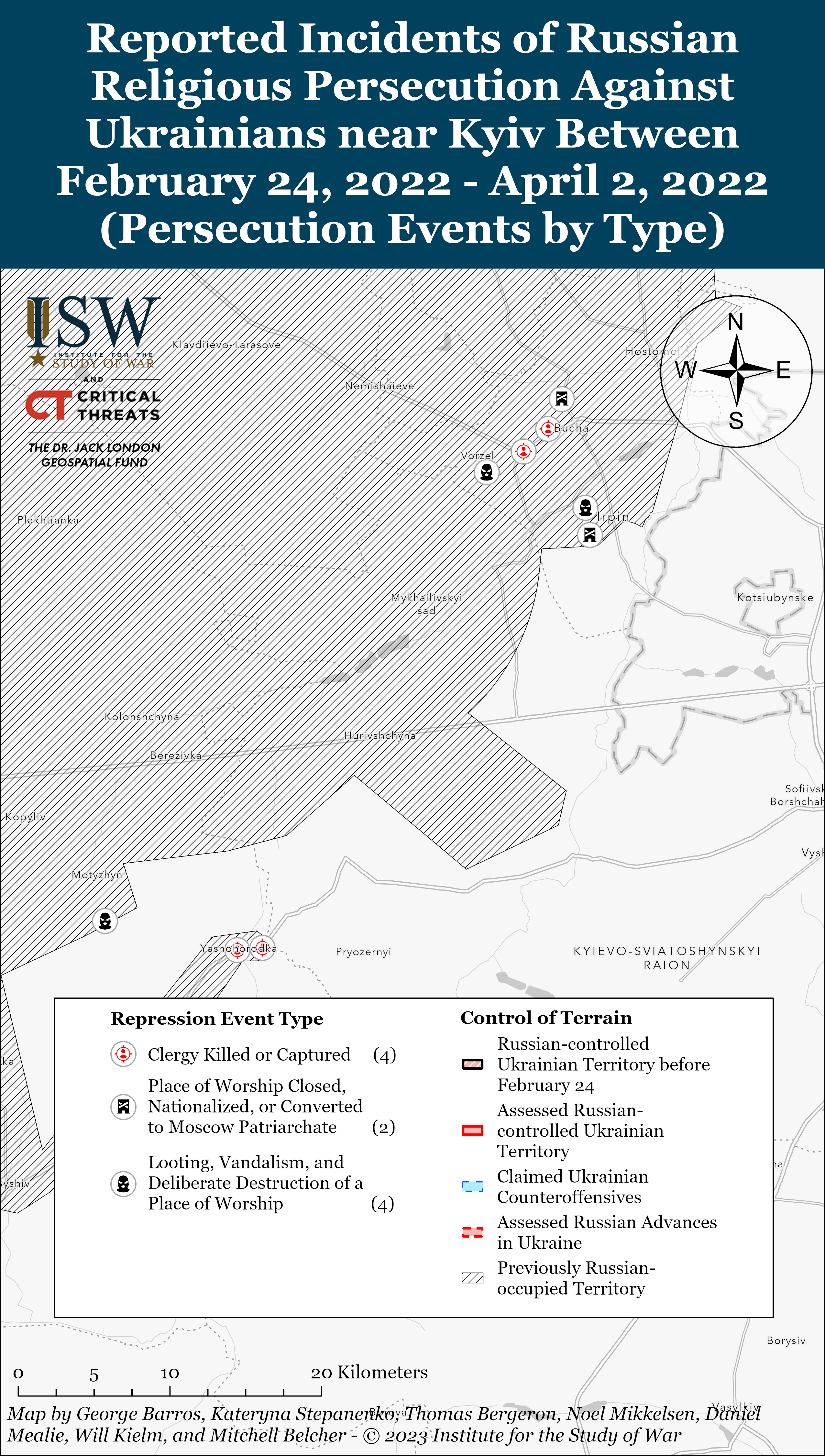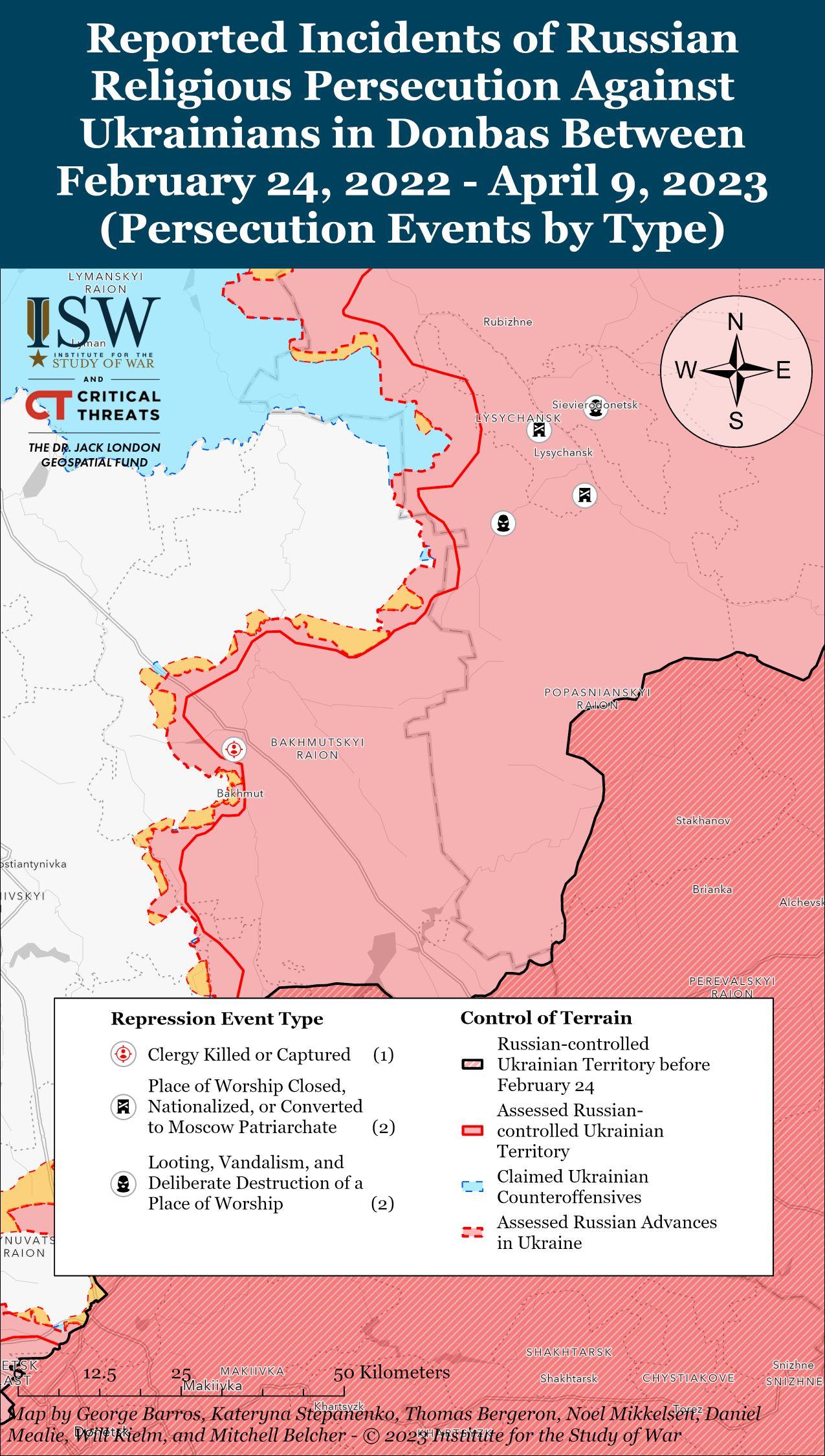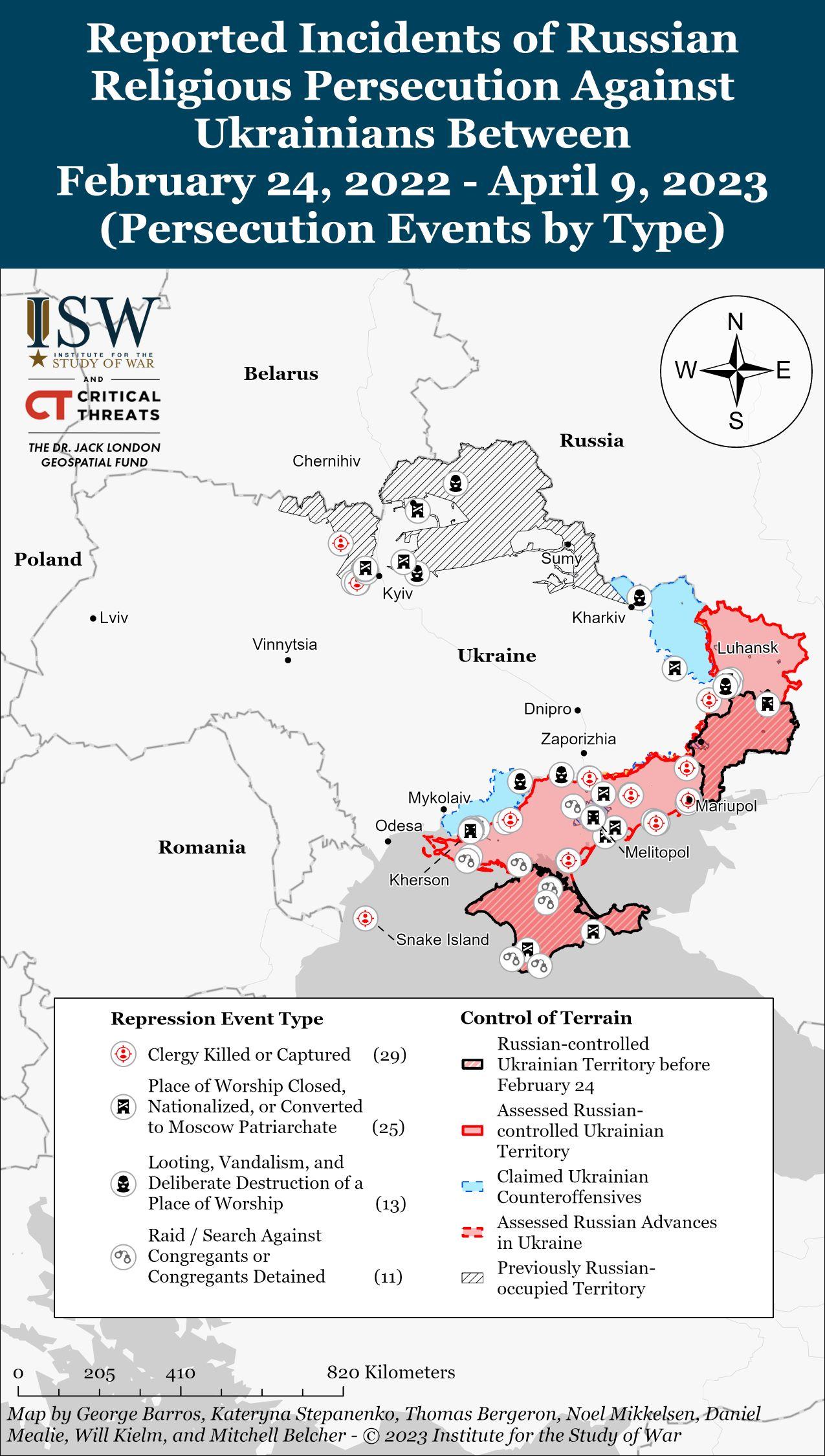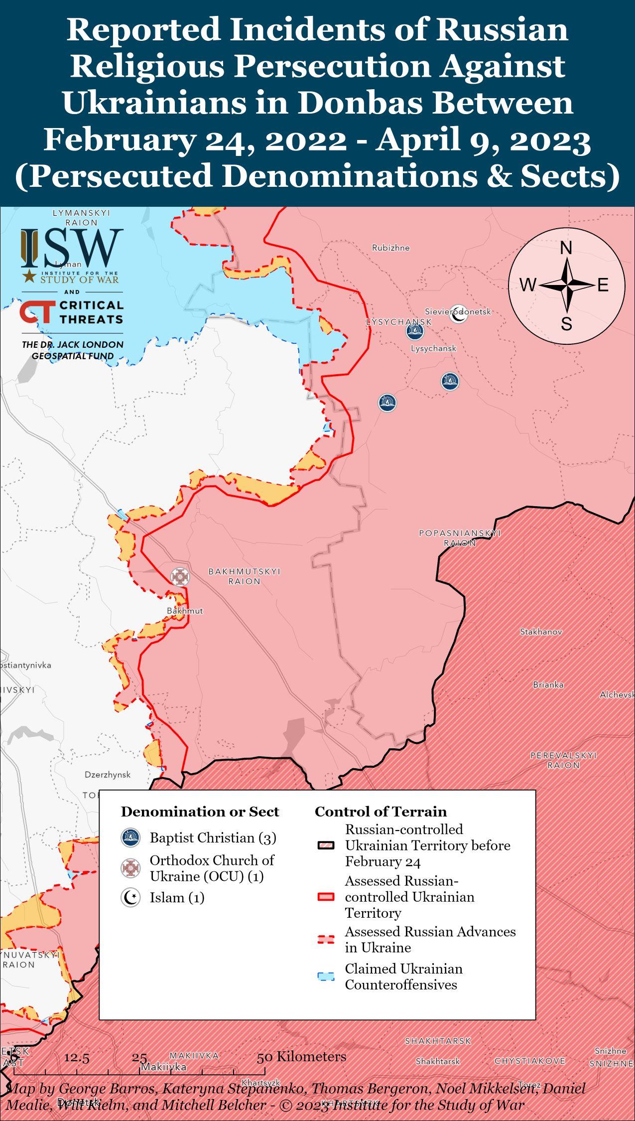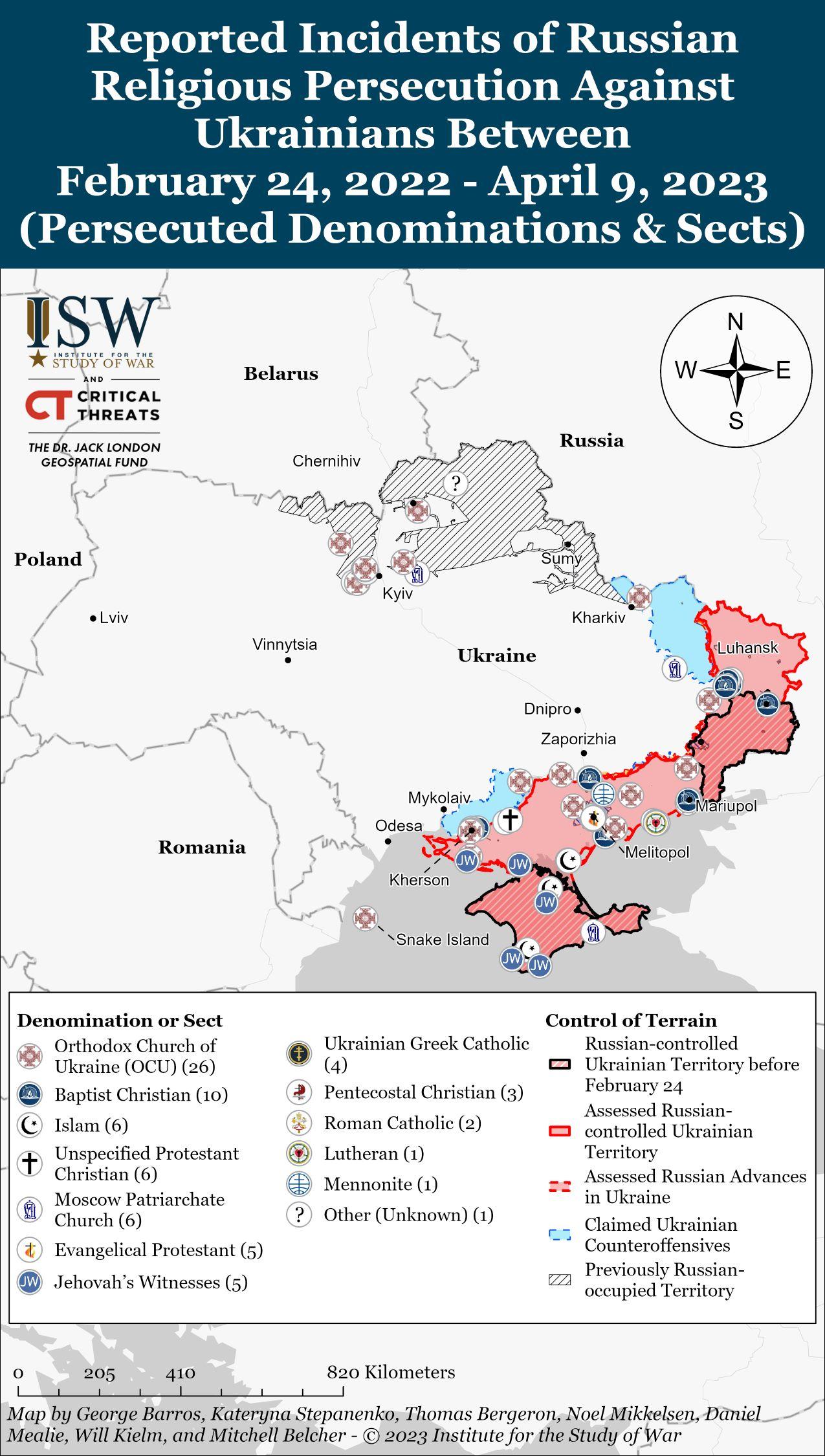 Россия продолжает вооружать религию в попытке дискредитировать Украину на международной арене и использует информационные операции о религии для продвижения военных целей, несмотря на то, что она совершает грубые нарушения религиозной свободы в оккупированной Украине. Россия может использовать предстоящий православный праздник Пасхи 16 апреля в попытке отсрочить украинское контрнаступление, призвав к прекращению огня из уважения к православной религии, несмотря на то, что Россия не проявила такого уважения к религии в районах, которые занимают ее силы. Российские религиозные преследования, вероятно, также являются частью продолжающейся российской кампании культурного геноцида и этнической чистки, направленной на искоренение идеи независимой украинской национальности или украинской православной церкви.