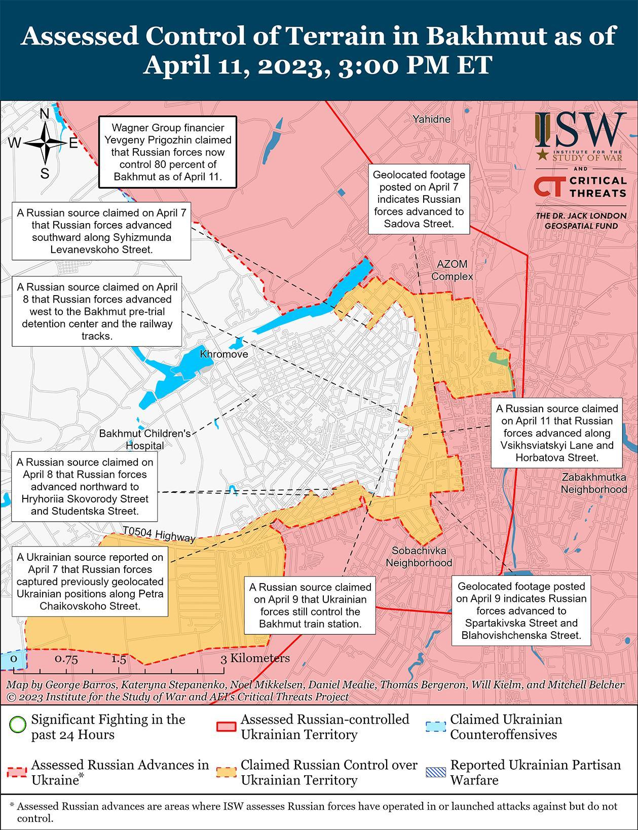 Министерство обороны России (МО) и финансист группы Вагнера Евгений Пригожин признали роль друг друга в бахмутских усилиях 11 апреля. Министерство обороны России и Пригожин утверждали, что бойцы Вагнера составляют основные усилия по захвату территории и продвижению украинских сил в центре Бахмута, в то время как неопределенные российские воздушно-десантные (ВДВ) элементы составляют вспомогательные усилия на флангах Вагнера к северу и югу от Бахмута, в том числе возле Зализнянского, Сакко и Ванцетти и Николаевки. Российские силы ВДВ на флангах, скорее всего, нацелены только на удержание флангов, а не на какие-либо значительные успехи. Этот набор сил предполагает, что Министерство обороны России намерено использовать группу Вагнера для захвата Бахмута, сводя к минимуму потери среди обычных российских сил, поддерживая предыдущие оценки ISW о том, что Министерство обороны стремится использовать силы Вагнера для захвата Бахмута, а затем вытеснить их и взять на себя ответственность за победу. Пригожин повторил, что силы Вагнера добиваются успехов в Бахмуте, утверждая, что российские войска контролируют 80 процентов Бахмута благодаря наступлению Вагнера. Российские войска занимают не менее 30,68 квадратных километров (размером с чикагский аэропорт О’Хара) или 76,5 процента Бахмута на основе контроля ISW над оценкой местности. Однако эта площадь увеличивается до 34,5 квадратных километров или 86,1 процента Бахмута с учетом всей территории Бахмута, на которую претендует Россия, включая противоречивые претензии.