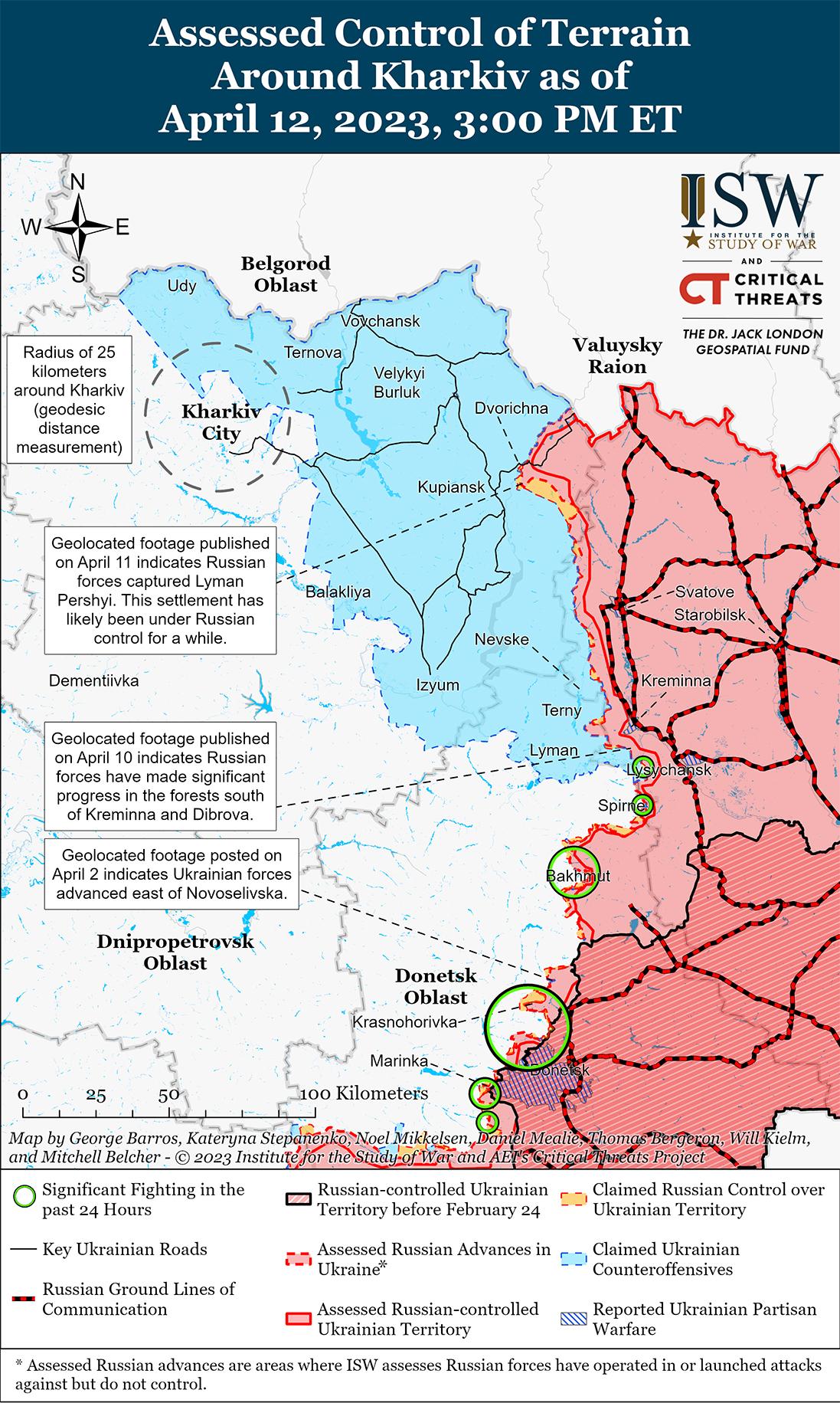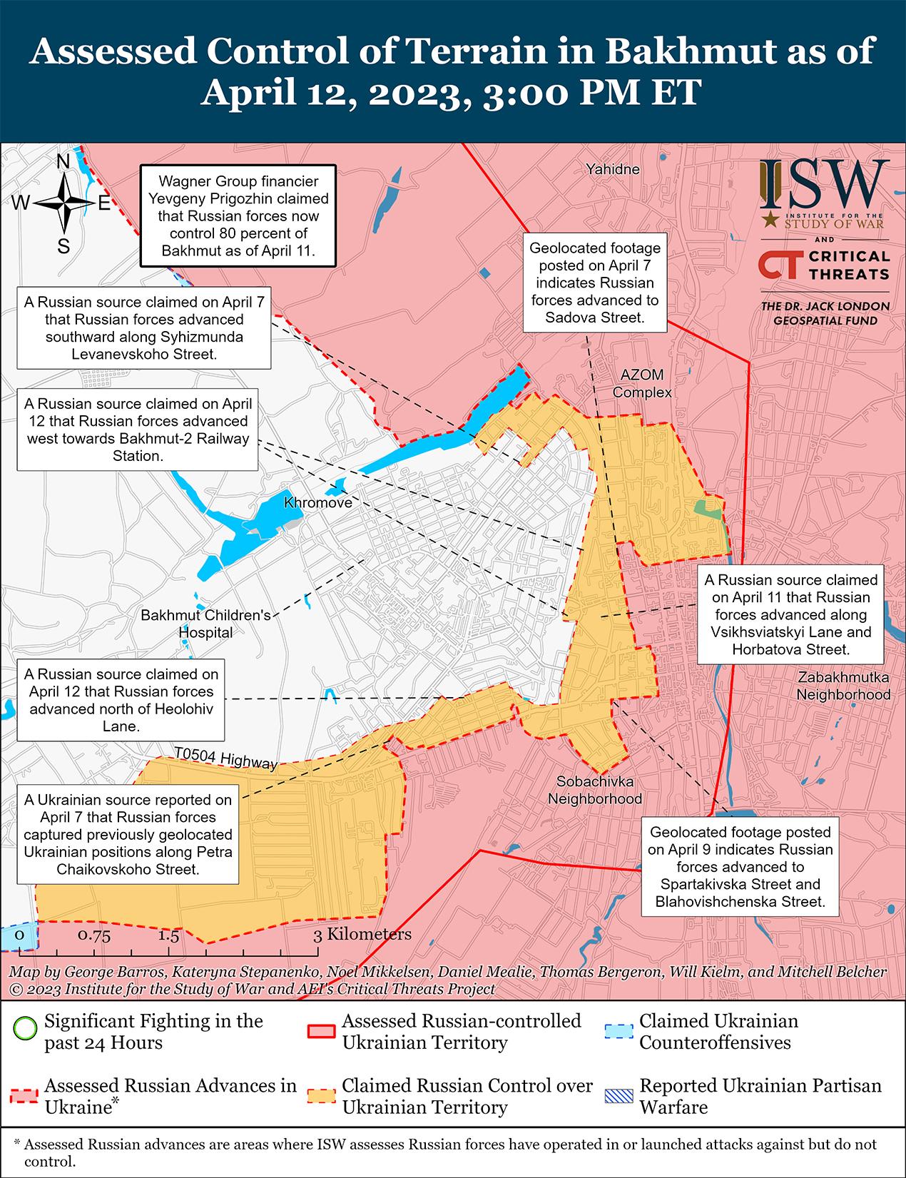 Российские войска продолжали наземные атаки в Бахмуте и вокруг него и не добились каких-либо подтвержденных успехов в городе 12 апреля. Украинский Генеральный штаб сообщил, что в Бахмуте продолжаются ожесточенные бои и что российские войска провели неудачные наступательные действия вблизи Хромово (3 км к западу от Бахмута) и Богдановка (5 км к северо-западу от Бахмута). Пресс-секретарь Восточной группы войск Украины полковник Сергей Череватый заявил, что силы Вагнера атакуют Бахмут в основном небольшими тактическими группами при поддержке обычных российских элементов. Министерство обороны России (МО) утверждало, что штурмовые отряды Вагнера захватили три неуказанных городских квартала в Бахмуте, в то время как российские воздушно-десантные элементы (ВДВ) прижали украинские силы к флангам Вагнера. Российские милблогеры утверждали, что боевики «Вагнера» атаковали украинские позиции вдоль улицы Петра Чайковского на юго-западе Бахмута и продолжали бои в северном, центральном и юго-западном секторах города. Один российский милблогер утверждал, что российские войска в настоящее время контролируют 80 процентов Бахмута, включая все центральные административные здания. Российские войска визуально подтвердили, что контролируют по меньшей мере 76,5 процента Бахмута, согласно данным ISW от 11 апреля.