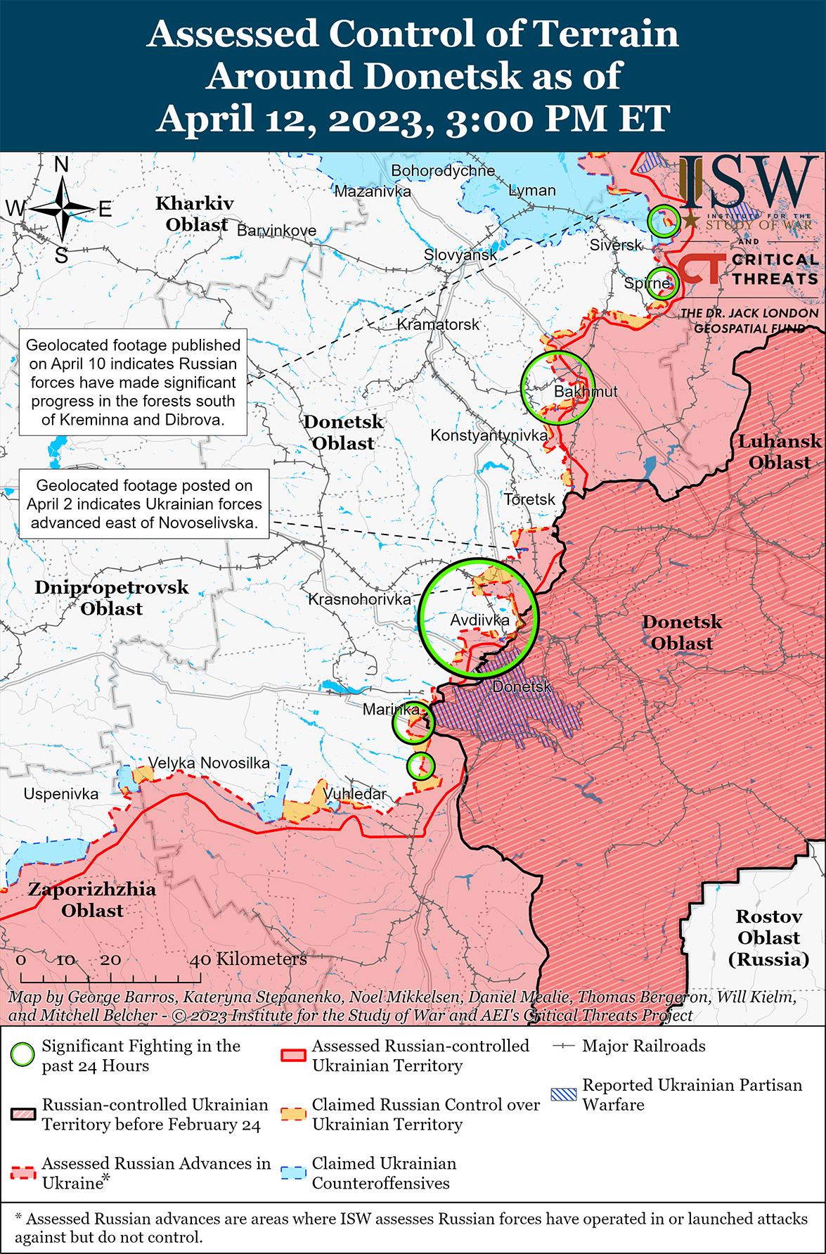 Российские войска продолжили наземные атаки вдоль линии фронта Авдеевка-Донецк 12 апреля. Геолоцированные кадры, опубликованные 11 апреля, показывают, что российские войска продвинулись вблизи Новобахмутовка (10 км к северу от Авдеевки) и пересекли трассу N20 Донецк-Краматорск-Славянск. Украинский Генеральный штаб доложил, что российские войска продолжают безуспешные наступательные операции в районе самой Авдеевки; на северо-западной окраине Донецка в районе Первомайского и Невельского; и на юго-западной окраине Донецка возле Марьинки и Победы. Российские милблогеры утверждали, что российские войска продолжали усилия по окружению Авдеевки с юга и что нынешняя линия фронта проходит менее чем в 1 км к югу от Северное (5 км к западу от Авдеевки). Российский милблогер также утверждал, что в западной Марьинке продолжаются боевые действия.
