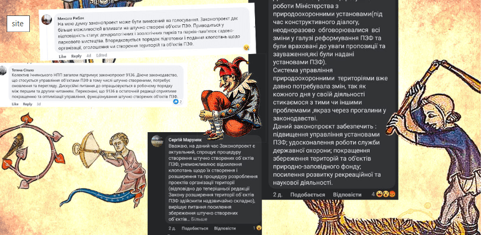 Реакцією стало примусове використання бюджетників, як у часи Януковича, але онлайн. Під спільною заявою екологічних ГО проти законопроєкту 9136 одночасно з’явилися коментарі багатьох директорів нацпарків та заповідників. Більшість з них писали загальні слова на підтримку законопроєкту. А коли екологи намагалися з’ясувати їхню позицію – ті або ухилялися, або наводили аргументи, які не стосувалися реальності.