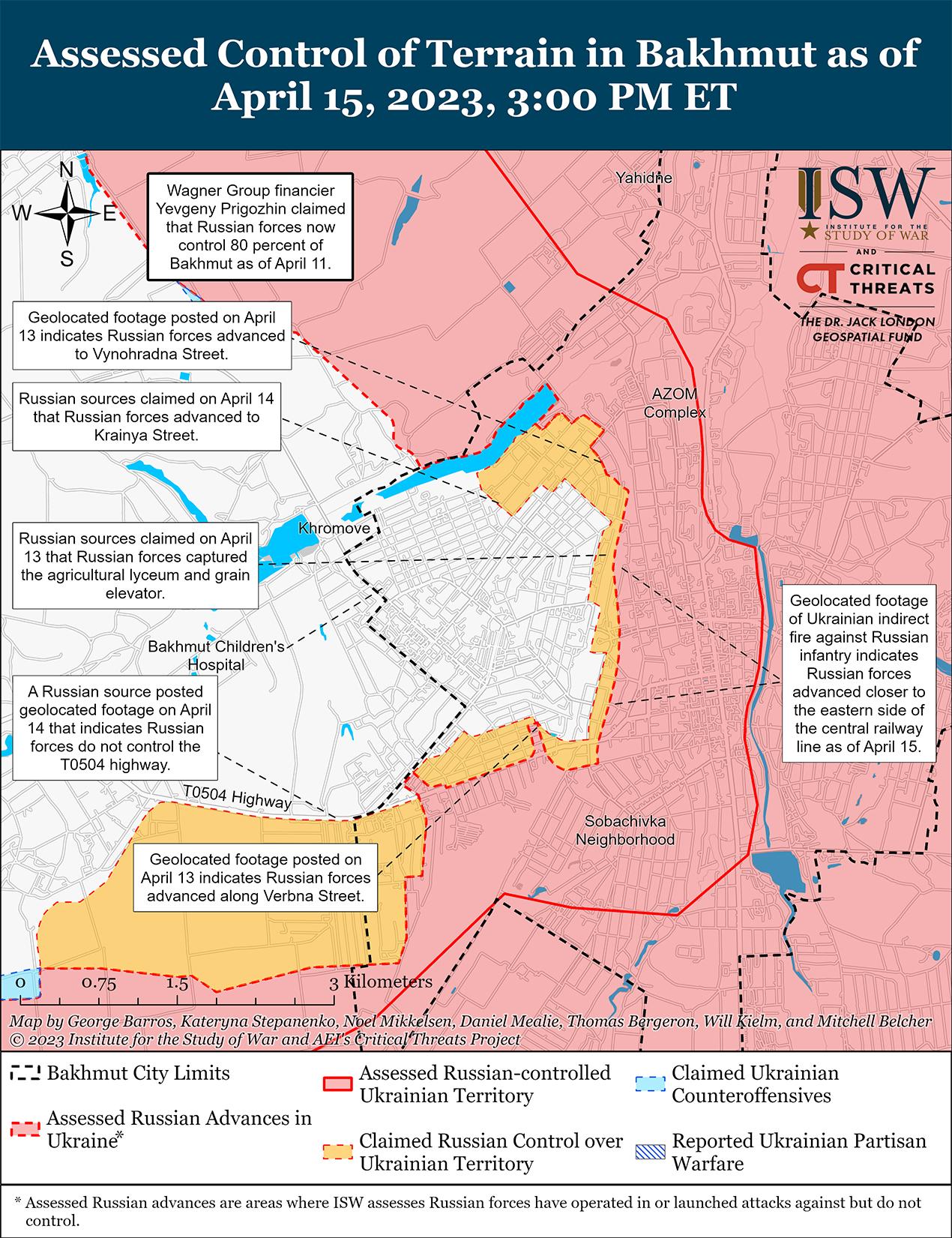 15 апреля российские войска продолжили наступательные действия в Бахмуте и его окрестностях. В украинском Генштабе сообщили, что в Бахмуте продолжаются тяжелые бои и что российские войска провели неудачные наступательные действия в районе Хромова (2 км к западу от Бахмута). Министерство обороны России заявило, что штурмовые отряды группы Вагнера захватили два неустановленных квартала на северной и южной окраинах города. 14 и 15 апреля российские источники утверждали, что бойцы «Вагнера» захватили железнодорожную станцию «Бахмут-2» и что большинство украинских сил покинули этот район, хотя ISW еще не видел визуального подтверждения ни того, ни другого. Российские источники утверждали, что бойцы Вагнера пересекли неуказанные участки железнодорожной линии в центре Бахмута. Один российский блогер заявил, что в районе улицы Освободителей Донбасса на западе Бахмута идут ожесточенные бои, хотя другие доступные российские репортажи и наблюдаемые темпы продвижения российских войск в городе указывают на то, что это утверждение, вероятно, преувеличено. Российские блогеры, утверждающие, что ведут репортажи из Бахмута, сообщили, что российские войска используют танки Т-90 в самом Бахмуте, предполагая, что у ЧВК Вагнера есть доступ к этим современным танкам для штурма города. Российский блогер заявил, что российские войска провели наземную атаку в направлении Приволья (18 км к северо-западу от Бахмута по трассе Е40 Бахмут-Славянск).