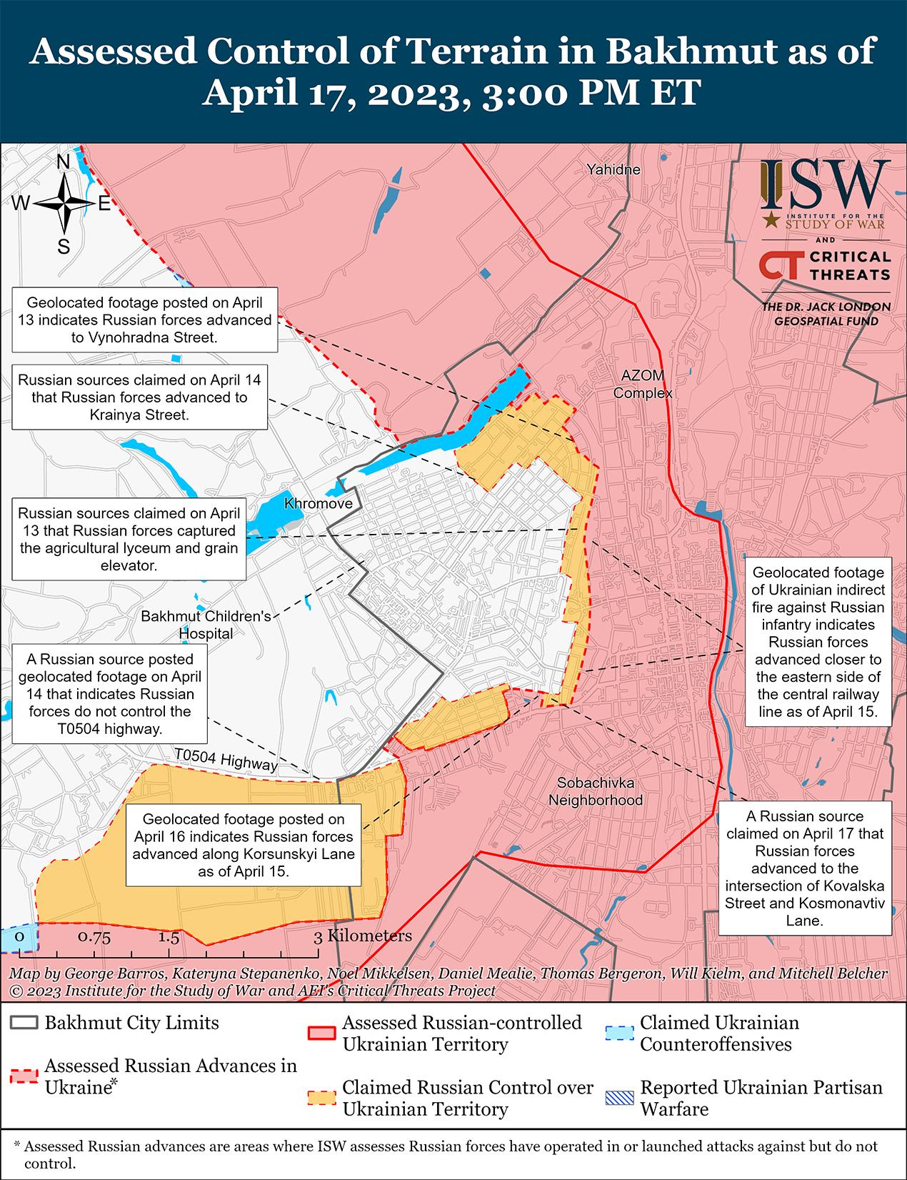 По состоянию на 17 апреля российские войска добились дальнейших успехов в Бахмуте. На геолокационных кадрах, опубликованных 16 апреля, видно, что силы группы Вагнера продвинулись к северу от трассы Т0504 Константиновка-Часов Яр-Бахмут вдоль главной железной дороги в Бахмуте. Министерство обороны России заявило, что штурмовые отряды, вероятно, имея в виду силы группы Вагнера, захватили два неустановленных квартала на северо-западе и в центре Бахмута. Российский блогер заявил, что ЧВК «Вагнер» продвинулся на севере Бахмута, пытается закрепиться между Бахмутом и Хромовом (2 км к западу от Бахмута) и ведет бои за контроль над железной дорогой в центре Бахмута. Милблогер также утверждал, что обычные российские войска ведут позиционные бои к северу от Бахмута. Другой блогер утверждал, что ЧВК «Вагнер» продолжает наносить наземные удары на севере, западе и юге Бахмута. Генштаб Украины сообщил, что российские войска проводили наземные атаки в Бахмуте, к северо-западу от Бахмута возле Хромово, а также к юго-западу от Бахмута в районе Ивановского (3 км к юго-западу) и Предтечино (12 км к юго-западу). Другие блогеры утверждали, что российские воздушно-десантные войска (ВДВ) и личный состав 2-го Луганского народного корпуса сформировали сплошную линию обороны вдоль северного фланга ЧВК Вагнера на линии Зализнянское — Сакко и Ванцетти — Николаевка — Яковлевка — Берестово, и что российская 106-я дивизия ВДВ действует на этой линии под Соледаром.