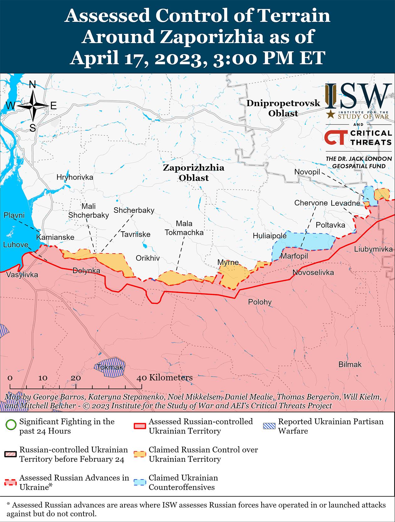 Финансист группы Вагнера Евгений Пригожин попытался оправдать медленное продвижение «Вагнера» в Бахмуте 17 апреля, вероятно, в попытке оказать давление на Министерство обороны России, чтобы оно обеспечило «Вагнер» постоянными и достаточными поставками артиллерийских снарядов. Пригожин утверждал, что силам Вагнера требуется не менее 6 000 снарядов в течение неопределенного периода времени, чтобы продвинуться более чем на 100-200 метров в день. Пригожин утверждал, что силы Вагнера понесут меньше потерь, если получат больше снарядов. Ранее Пригожин критиковал Министерство обороны за то, что оно не предоставило Вагнеру достаточное количество артиллерийских снарядов, и призвал информационное пространство оказать давление на Министерство обороны, чтобы оно предоставило больше.