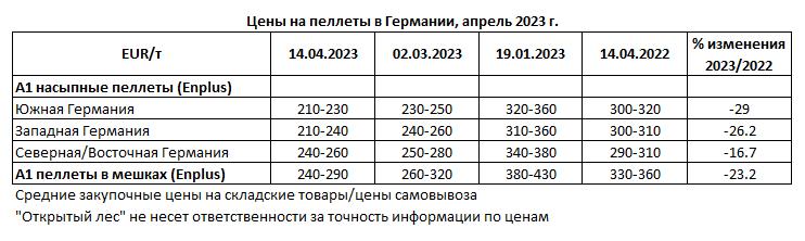 Вслед за сдержанной деловой активностью в первом квартале 2023 года в первых числах апреля на рынках пеллет Германии наблюдался заметный рост спроса со стороны коммерческих и конечных покупателей. Согласно заявлениям производителей и торговли топливом, как коммерческие, так и конечные потребители все чаще приходят к выводу, что тенденция к снижению цен на пеллеты А1, очевидная с сентября, постепенно подходит к концу. Так, в последние дни отдельные ритейлеры запустили первые кампании по пополнению запасов, ориентированные на конечных покупателей; эти кампании в основном распространяются на заказы, размещенные в текущем месяце, которые должны быть доставлены к концу июня. Таким образом, эти кампании привели к относительно высокому уровню поступающих заказов. Сроки доставки конечным клиентам снова увеличились в среднем примерно до двух-трех недель, в зависимости от поставщика.