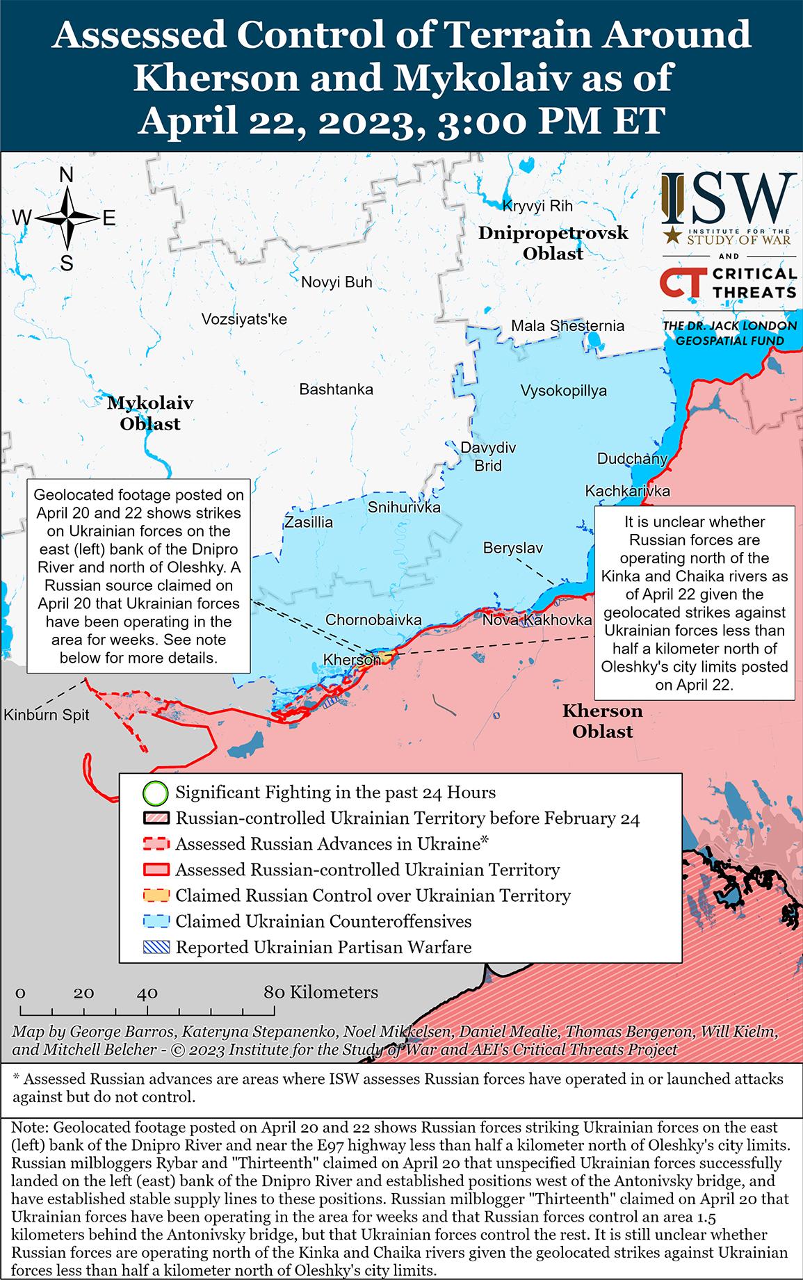Российские военные блогеры предоставили достаточно геолоцированных кадров и текстовых сообщений, чтобы подтвердить, что украинские силы заняли позиции на восточном (левом) берегу Херсонской области по состоянию на 22 апреля, но не в каком масштабе и с какими намерениями. Геолокационные кадры, опубликованные российским милблогером 22 апреля, показывают, что украинские силы заняли позиции на берегу реки Днепр к северу от Олешек (7 км к юго-западу от Херсона) и продвинулись до северной окраины населенного пункта по трассе Е97, а также к западу от Дачи (10 км к югу от Херсона). На этих кадрах также видно, что российские войска не могут контролировать острова на реках Кинка и Чайка, расположенные менее чем в полукилометре к северу от геолоцированных украинских позиций возле Антоновского моста. Российские блогеры утверждали 20 и 22 апреля, что украинские силы удерживают позиции на восточном берегу Херсонской области в течение нескольких недель, устанавливают стабильные линии снабжения этих позиций и регулярно проводят вылазки в этом районе, что указывает на отсутствие российского контроля над этим районом. На карте сражений другого милблогера утверждалось, что по состоянию на 22 апреля российские войска не контролируют некоторые острова дельты реки Днепр к юго-западу от Херсона, что предполагает возможное продвижение Украины на эти острова. Некоторые блогеры жаловались, что медленный темп огня российской артиллерии из-за чрезмерной централизации российского военного командования позволил украинским войскам высадиться на восточном берегу. Российские силы могут уделять приоритетное внимание поддержанию обороны в городских районах, таких как Олешки и Новая Каховка, оставляя острова в дельте Днепра без присмотра. Масштабы и цели этих украинских позиций остаются неясными, равно как и способность и готовность Украины сохранять устойчивые позиции в этой области. ISW пересматривает территорию на восточном берегу Днепра в удерживаемую Украиной только сейчас, потому что это первый раз, когда ISW получил надежные геолокационные снимки украинских позиций на восточном берегу, а также российские сообщения из нескольких источников о длительном украинском присутствии там.
