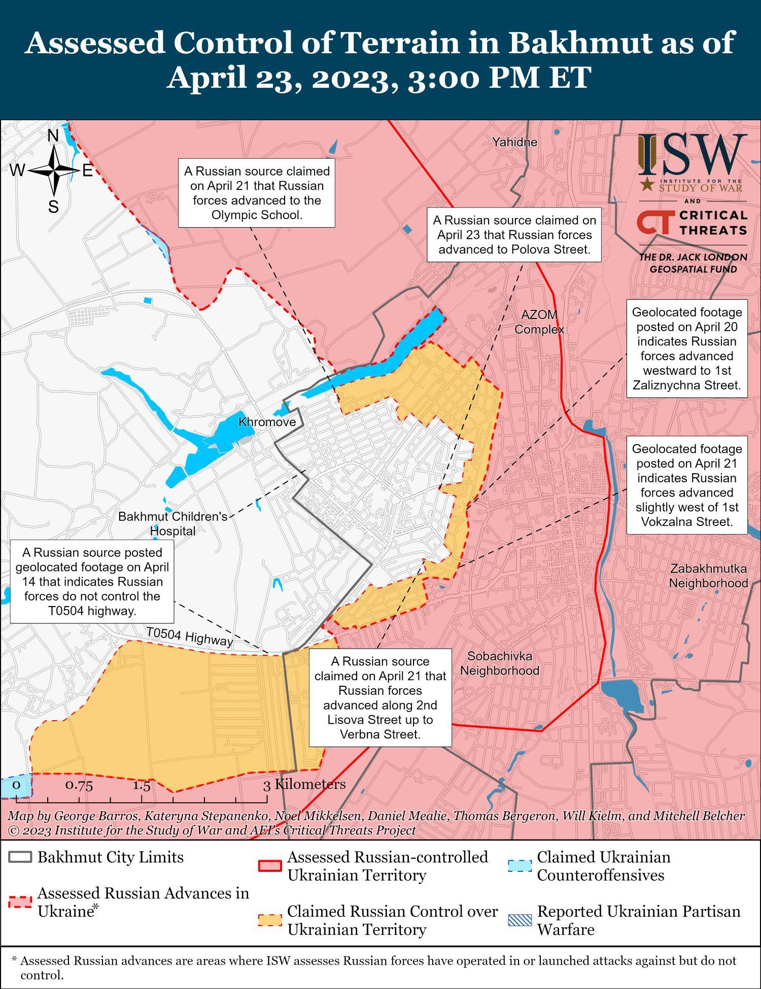 Нынешняя российская модель действий вокруг Бахмута говорит о том, что российское военное руководство все больше отдает приоритет завершению захвата города до начала украинского контрнаступления, если это возможно. Группа Вагнера продолжает нести большие потери. Вполне возможно, что в какой-то момент удастся завершить захват города. Чтобы поддержать наступление Вагнера после его кульминации, Министерство обороны России задействовало формирования ВДВ, чтобы позволить Вагнеру почти полностью сосредоточиться на городских боях. Финансист и руководитель ЧВК «Вагнер» Евгений Пригожин уступил северный и юго-западный фланги МО России и подтвердил, что элементы ВДВ таким образом поддерживают основные усилия «Вагнера» в Бахмуте. Поддержка ВДВ в этом районе, вероятно, позволит группе Вагнера добиться больших успехов в городе и может убедить украинские силы отступить. Подразделения ВДВ под Бахмутом, вероятно, более удалены от прямых, сильно изнурительных городских боев, чем элементы Вагнера, и, таким образом, вероятно, выйдут из битвы за Бахмут в значительно лучшей форме, чем Вагнер.
