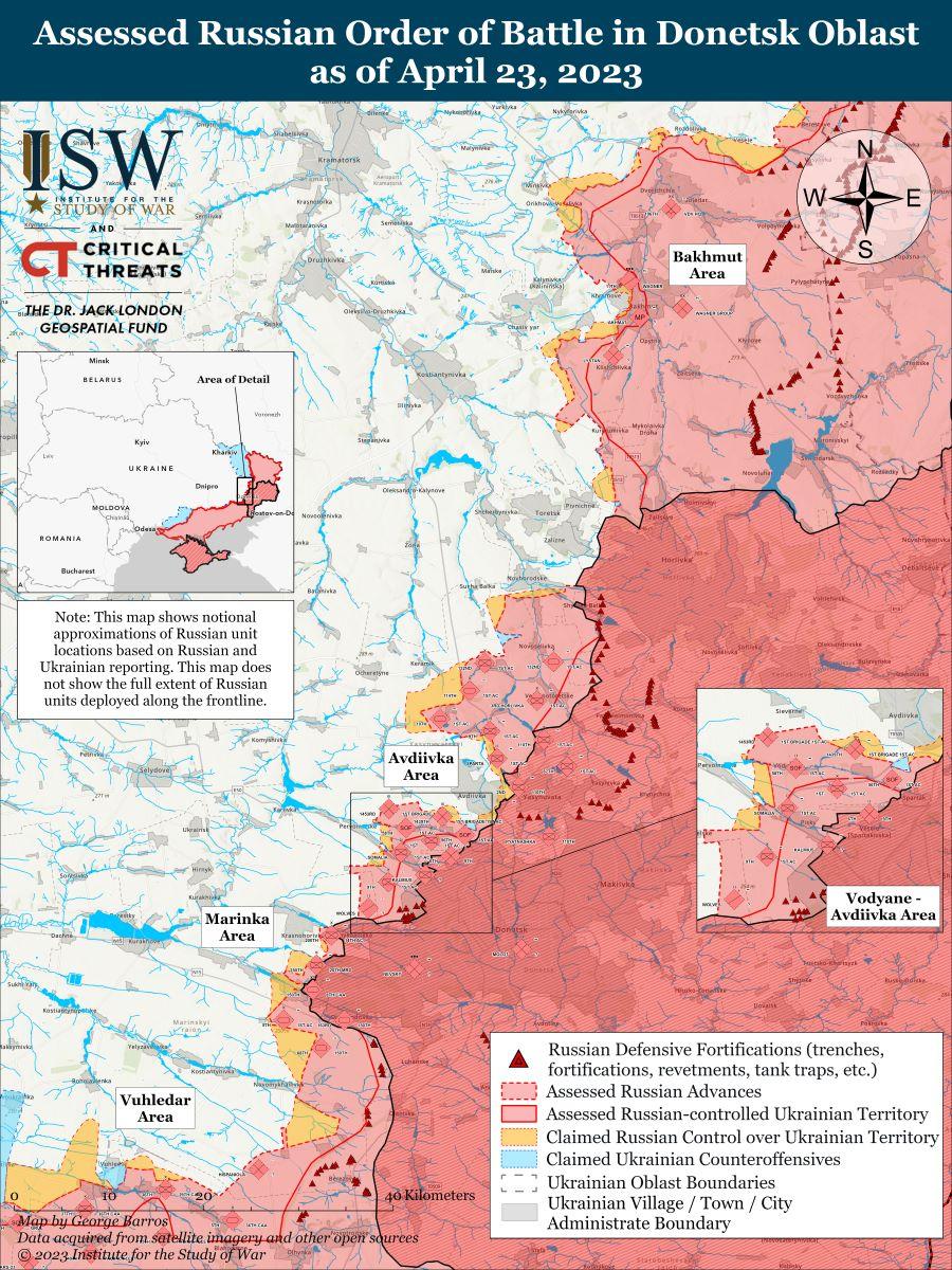 Сегодня, 23 апреля, ISW публикует специальную оценку кампании. В этом отчете изложен текущий боевой порядок (БП) России в Украине, оценены наступательные и оборонительные возможности российских группировок войск по фронту, а также обсуждаются основные факторы, которые могут осложнить оборонительные операции России в случае украинского контрнаступления.