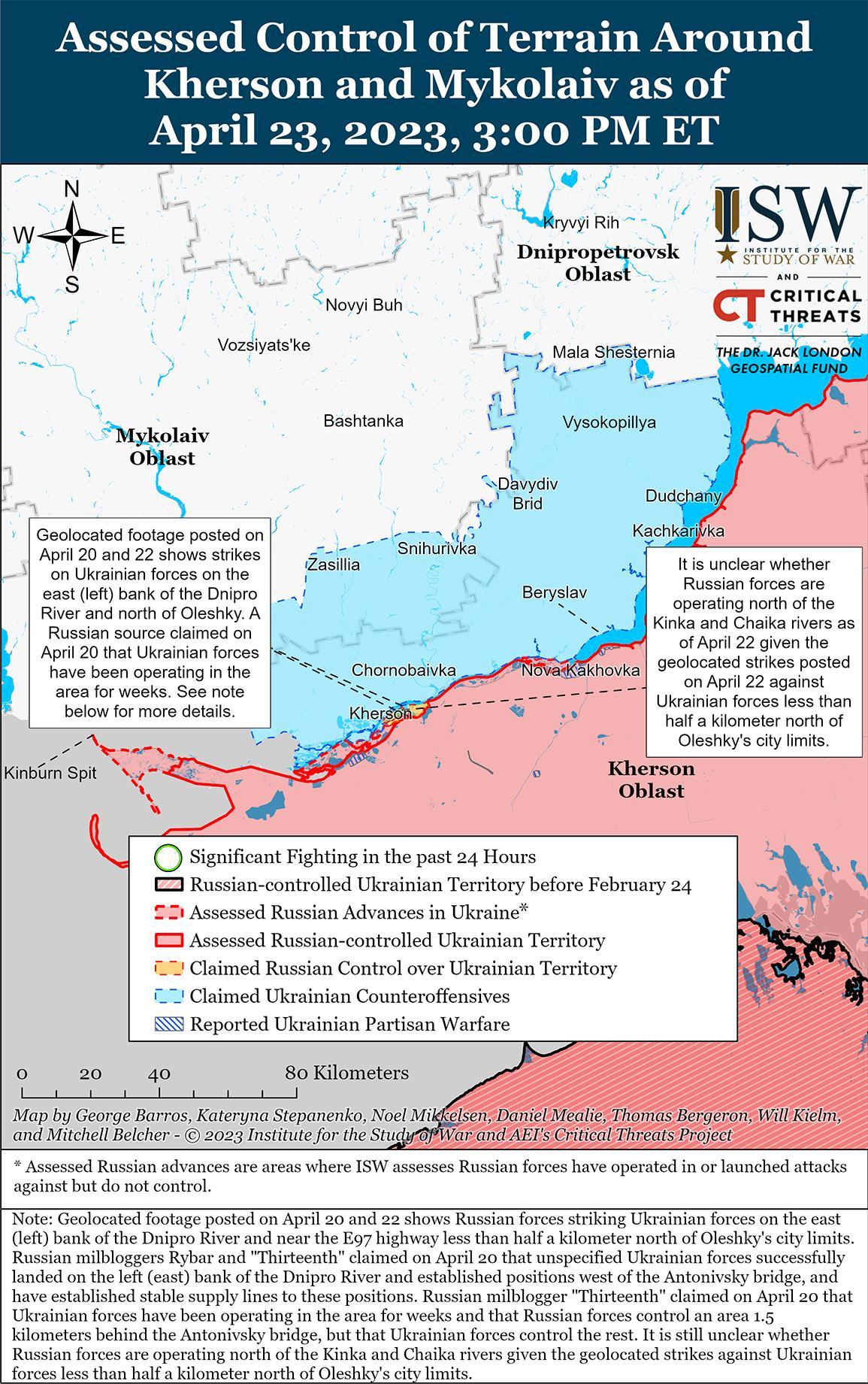 - Советник украинской Херсонской областной администрации Сергей Хлан заявил 22 апреля, что бойцы группы Вагнера помогают российским оккупационным чиновникам установить контроль над гражданским населением на восточном (левом) берегу Днепра в Херсонской области.