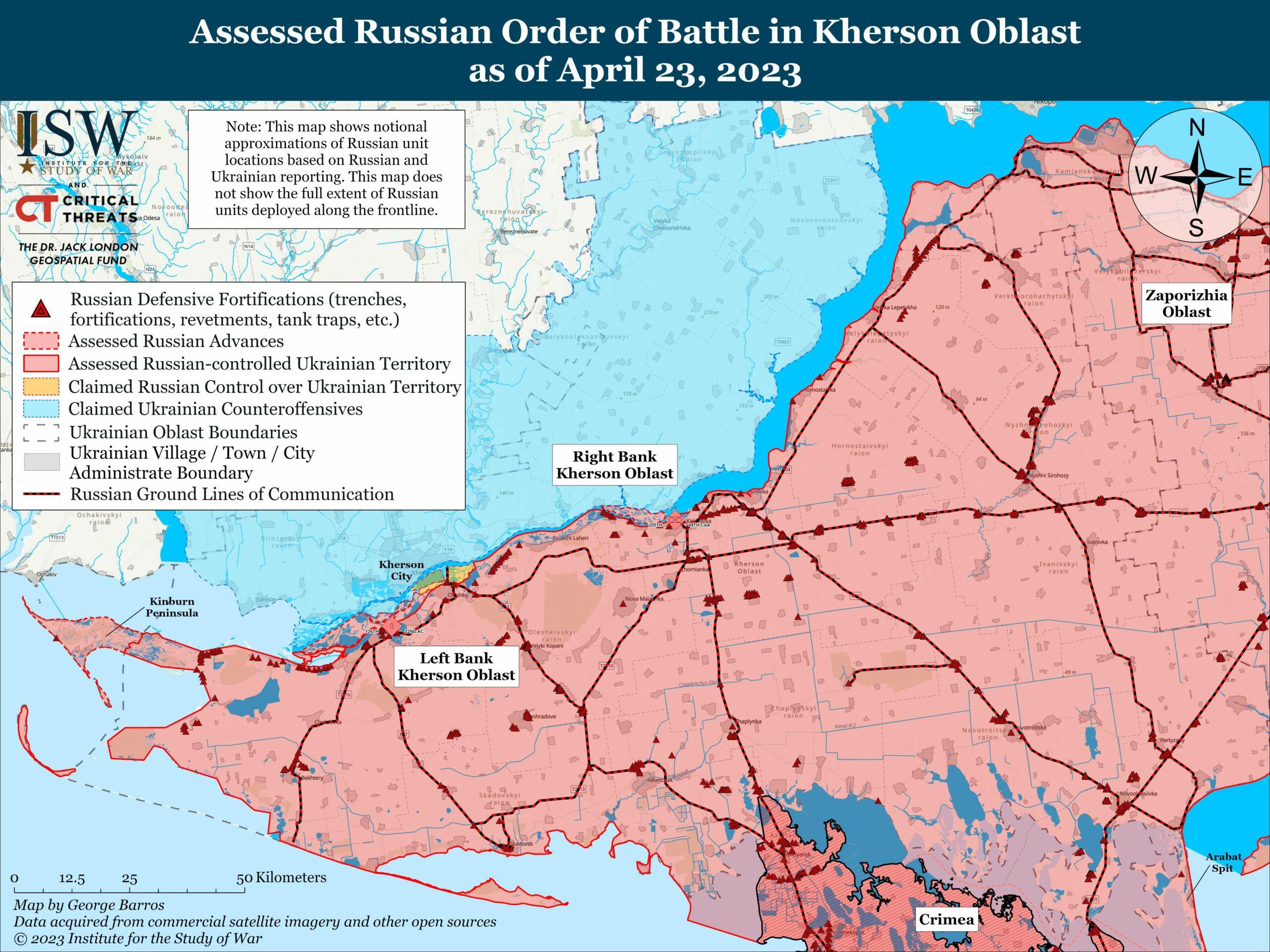 Этот отчет основан на ряде предположений об украинских возможностях, которые ISW не пытается оценивать или сообщать о них. Предполагается, в частности, что Украина сможет провести скоординированную многобригадную механизированную наступательную операцию, в полной мере используя заявленные девять бригад, которые готовятся к этой операции. Эта задача сложна и масштабнее, чем любые наступательные усилия, предпринятые Украиной до сих пор (например, четыре украинские бригады были задействованы в контрнаступлении на Харьков). Она также предполагает, что Украина интегрировала в свои подразделения достаточное количество танков и бронетранспортеров различных видов для поддержки расширенного механизированного маневра, что украинские механизированные подразделения будут иметь достаточное количество боеприпасов всех видов, включая артиллерию, и что Украина сможет наносить высокоточные удары большой дальности с помощью HIMARS и других подобных систем, интегрированных с маневренными операциями и поддерживающих их, как она это делала раньше. Она также предполагает, что украинские силы будут иметь возможности для разминирования и наведения мостов, необходимые для относительно быстрого продвижения через подготовленные оборонительные позиции. ISW не видит причин подвергать сомнению какие-либо из этих предположений, учитывая интенсивность, с которой, как сообщается, Украина готовилась к этой операции, и время, которое ей потребовалось для этого, а также оборудование, которое, как сообщается, было поставлено украинским силам западными странами. Однако, если какое-либо значительное количество этих предположений окажется неверным, то некоторые из приведенных ниже оценок и наблюдений также будут недействительными, и перспективы русских удержать свои позиции будут лучше, чем показано ниже. ISW не предлагает никаких оценок или доказательств этих предположений и, следовательно, не предлагает конкретного прогноза относительно характера, масштаба, местоположения, продолжительности или исхода предстоящего украинского контрнаступления. У Украины есть привлекательные варианты наступательных операций по всей линии, и ISW не считает, что информация, представленная в этом отчете, или какие-либо наблюдения, сделанные ISW ниже, явно приводят к выводу о том, что украинские силы будут атаковать в том или ином районе.