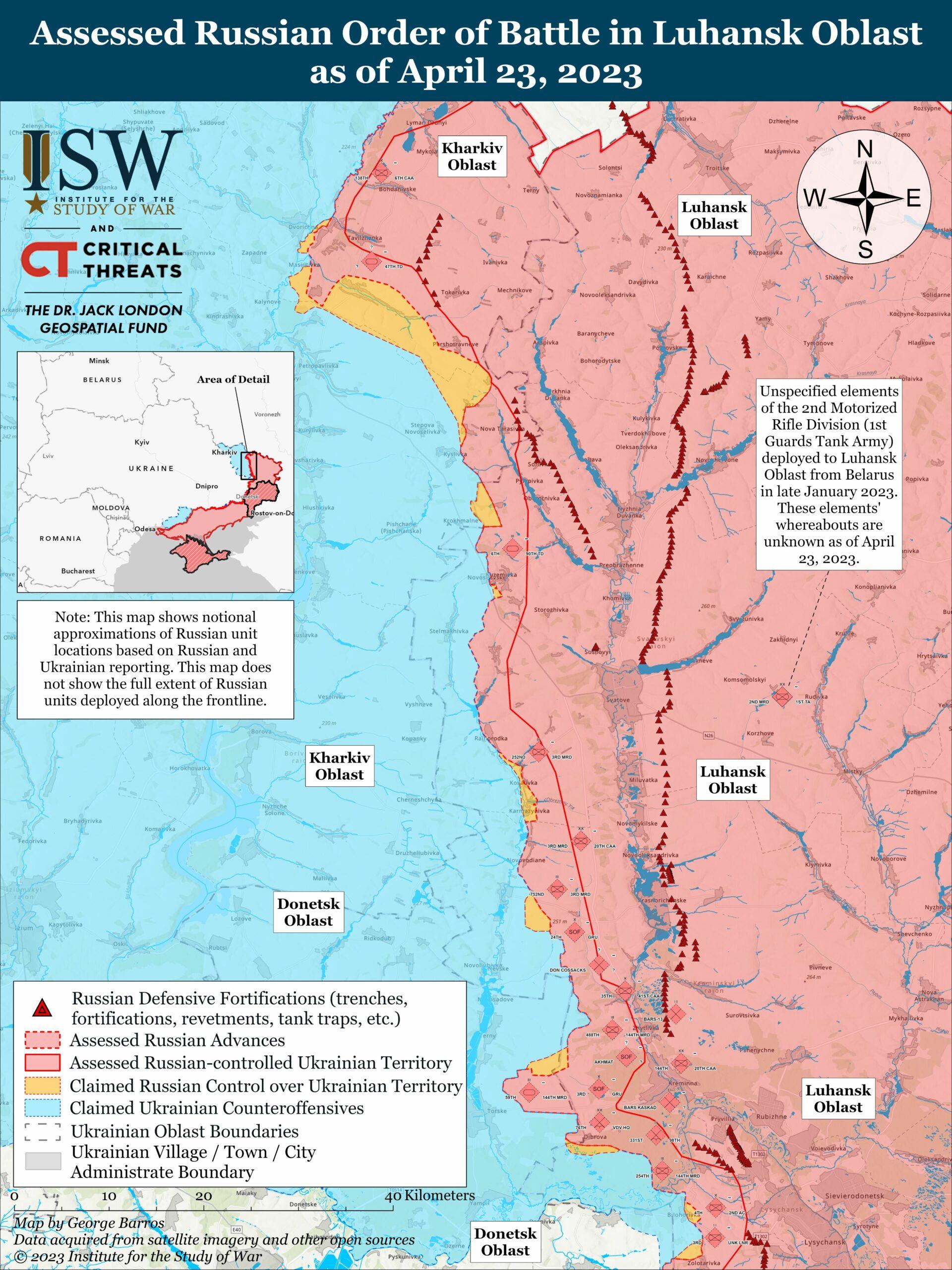 В 2023 году российским войскам не удалось добиться значительных успехов в Луганской области, несмотря на активное участие подразделений как минимум трех армий двух военных округов, подразделений двух дивизий ВДВ и поддержку многочисленных нерегулярных формирований. Силы, которые сражались вдоль этой линии в течение большей части четырех месяцев, вероятно, истощены и существенно деградировали. Они продолжали атаковать, не менялись, чтобы отдохнуть и перевооружиться, и, похоже, не подготовились к украинскому наступлению.