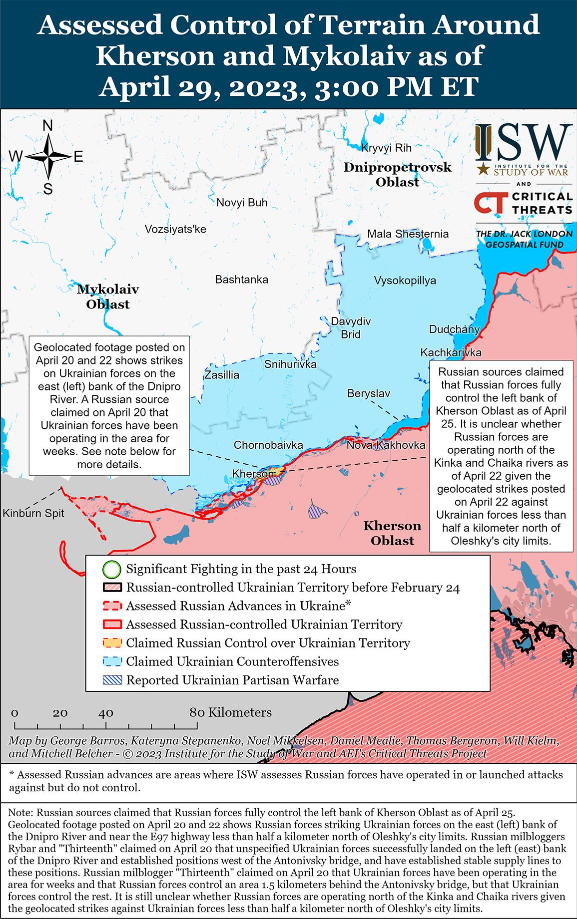 В Минобороны России заявили, что вечером 28 апреля российские войска нанесли ракетный удар морского базирования по командному пункту украинской Херсонской группировки войск. 29 апреля российское государственное новостное агентство «РИА Новости» опубликовало кадры, на которых корабль Черноморского флота России запускает ракеты «Калибр» предположительно по украинскому командному пункту. Украинские официальные лица не прокомментировали заявление России. 29 апреля российские войска продолжали вести обычный огонь на передовой к западу от Гуляйполя и в Херсонской области. 29 апреля российский блогер опубликовал кадры, на которых российские войска наносят удары по украинским позициям возле Гуляйполя из термобарической артиллерийской системы ТОС-1А. ISW по-прежнему считает, что выделение этого актива на уровне военного округа не даст российским войскам решающего преимущества на поле боя.