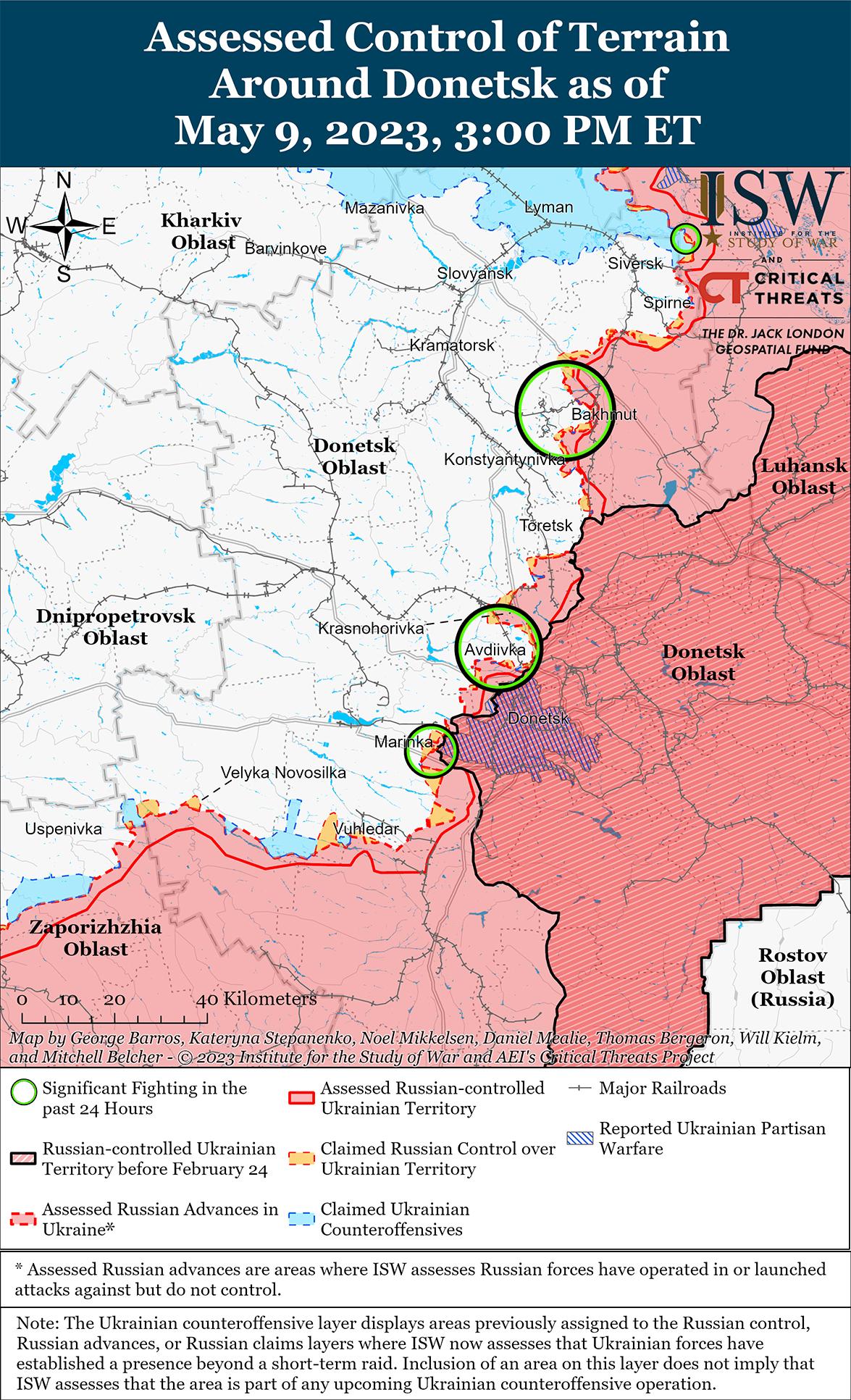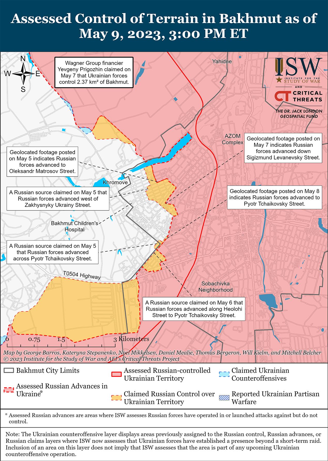 По состоянию на 9 мая российские войска продолжали добиваться незначительных успехов в Бахмуте. Геолокационные кадры, опубликованные 8 мая, указывают на то, что российские войска, вероятно, продвинулись дальше в западном Бахмуте. Финансист группы Вагнера Евгений Пригожин заявил 8 мая, что бойцы Вагнера продвинулись на 130 м в пределах Бахмута и что украинские силы в настоящее время контролируют 2,36 квадратных километра города. 9 мая Пригожин и российские источники утверждали, что украинские силы нанесли удар HIMARS по тюрьме Вагнера под Бахмутом, хотя ISW не видел визуального подтверждения этого утверждения. Добровольческий батальон «Невский» утверждал, что действует под Бахмутом, а ISW ранее сообщал, что российские источники утверждали, что батальон «Невский» был переброшен в Украину в деградированном состоянии. Российские милблогеры утверждали, что бойцы ЧВК Вагнера безуспешно пытались прорваться к Хромову (непосредственно к западу от Бахмута) и что российские войска активно перехватывают последние оставшиеся украинские наземные линии коммуникаций (НЛК) в Бахмут. Пресс-секретарь Восточной группировки войск Украины полковник Сергей Череватый сообщил о восьми столкновениях в районе Бахмута, что, возможно, свидетельствует о том, что недавние заявления об активизации операций ЧВК Вагнера в городе и его окрестностях не отражают постоянных усилий по наращиванию темпов операций. Генштаб Украины сообщил, что российские войска провели безуспешные наступательные действия в Бахмуте и вблизи Ивановского (6 км к западу от Бахмута), Часов Яра (12 км к западу от Бахмута) и Ступпочек (13 км к юго-западу от Бахмута).